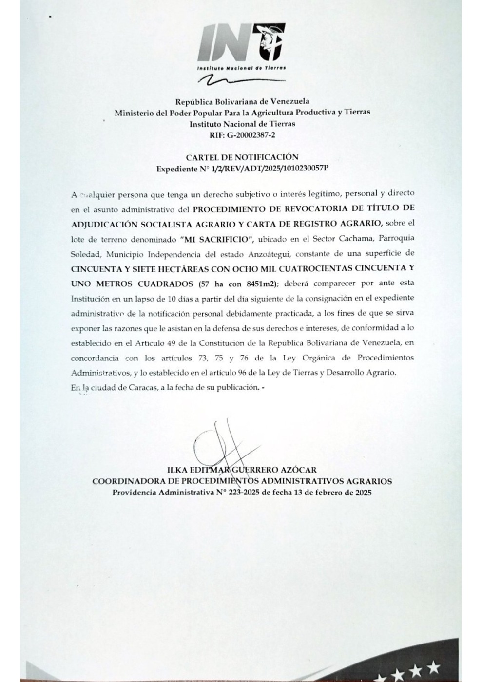 El INTI, Instituto Nacional de Tierras, emitió un Cartel de Notificación en relación al Procedimiento de Revocatoria de Título de Adjudicación Socialista Agrario y Carta de Registro Agrario, sobre el lote de terreno denominado «Mi Sacrificio», ubicado en el sector Cachama, parroquia Soledad, municipio Independencia del estado Anzoátegui. El documento está suscrito por Ilka Guerrero Azócar, coordinadora de procedimientos administrativos agrarios.