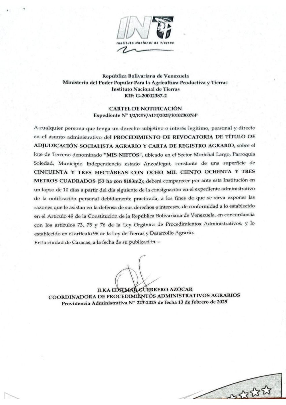 El INTI, Instituto Nacional de Tierras, emitió un Cartel de Notificación en relación al Procedimiento de Revocatoria de Título de Adjudicación Socialista Agrario y Carta de Registro Agrario, sobre el lote de terreno denominado «Mis Nietos», ubicado en el sector Morichal Largo, parroquia Soledad, municipio Independencia del estado Anzoátegui. El documento está suscrito por Ilka Guerrero Azócar, coordinadora de procedimientos administrativos agrarios.