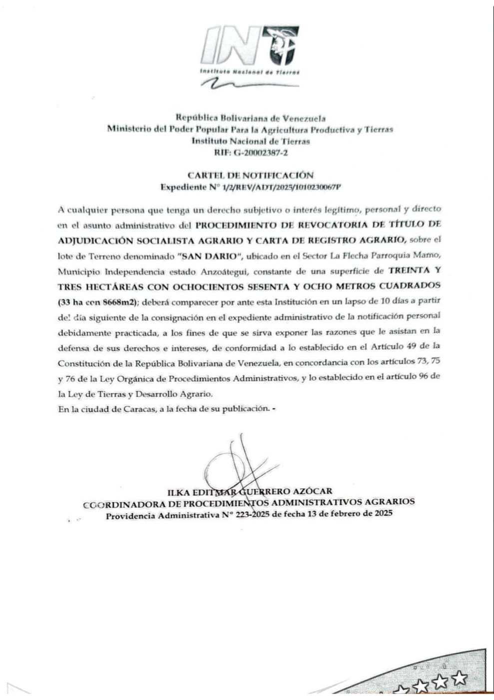 El INTI, Instituto Nacional de Tierras, emitió un Cartel de Notificación en relación al Procedimiento de Revocatoria de Título de Adjudicación Socialista Agrario y Carta de Registro Agrario, sobre el lote de terreno denominado «San Darío», ubicado en el sector La Flecha, parroquia Mamo, municipio Independencia del estado Anzoátegui. El documento está suscrito por Ilka Guerrero Azócar, coordinadora de procedimientos administrativos agrarios.