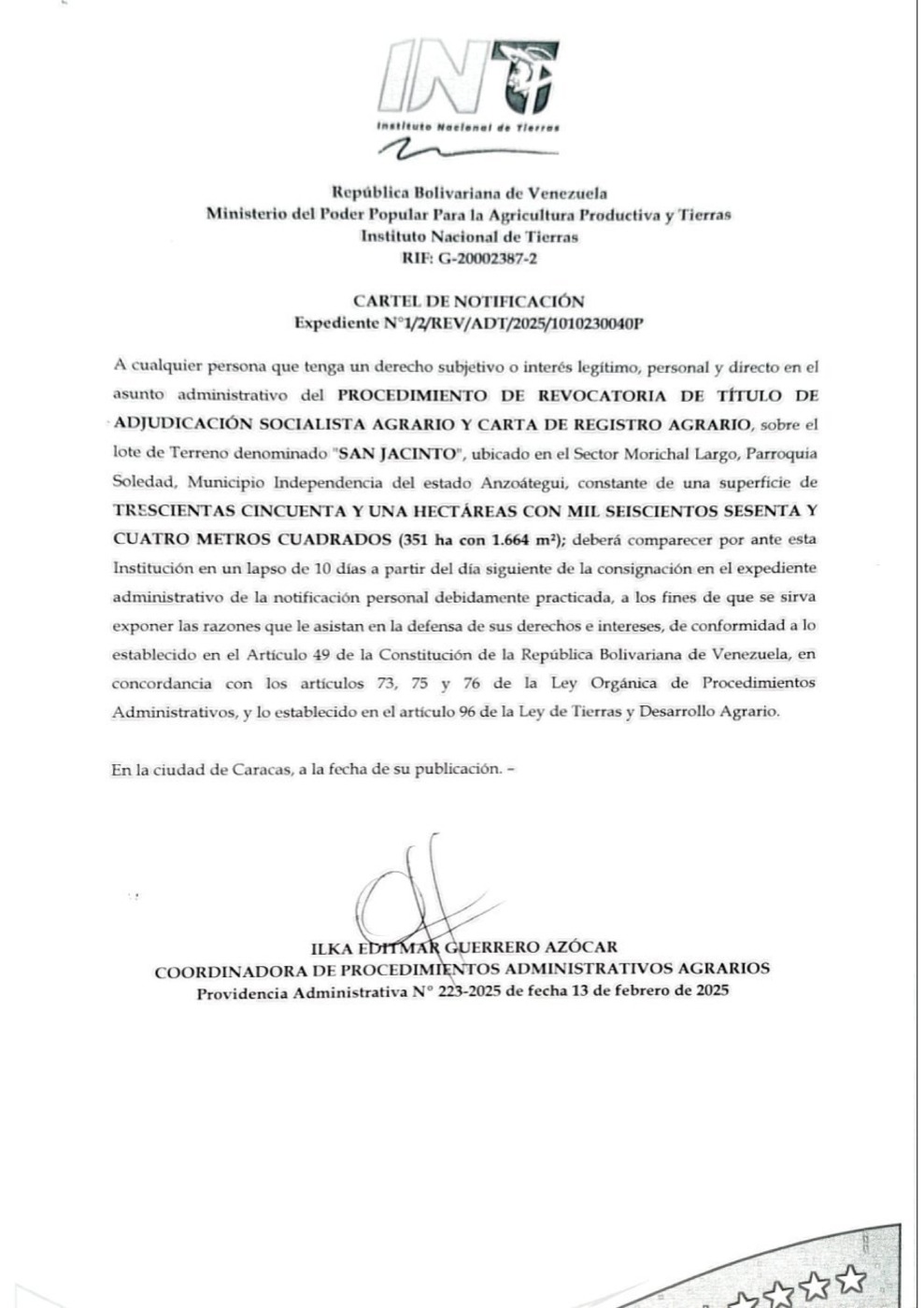El INTI, Instituto Nacional de Tierras, emitió un Cartel de Notificación en relación al Procedimiento de Revocatoria de Título de Adjudicación Socialista Agrario y Carta de Registro Agrario, sobre el lote de terreno denominado «San Jacinto», ubicado en el sector Morichal Largo, parroquia Soledad, municipio Independencia del estado Anzoátegui. El documento está suscrito por Ilka Guerrero Azócar, coordinadora de procedimientos administrativos agrarios.