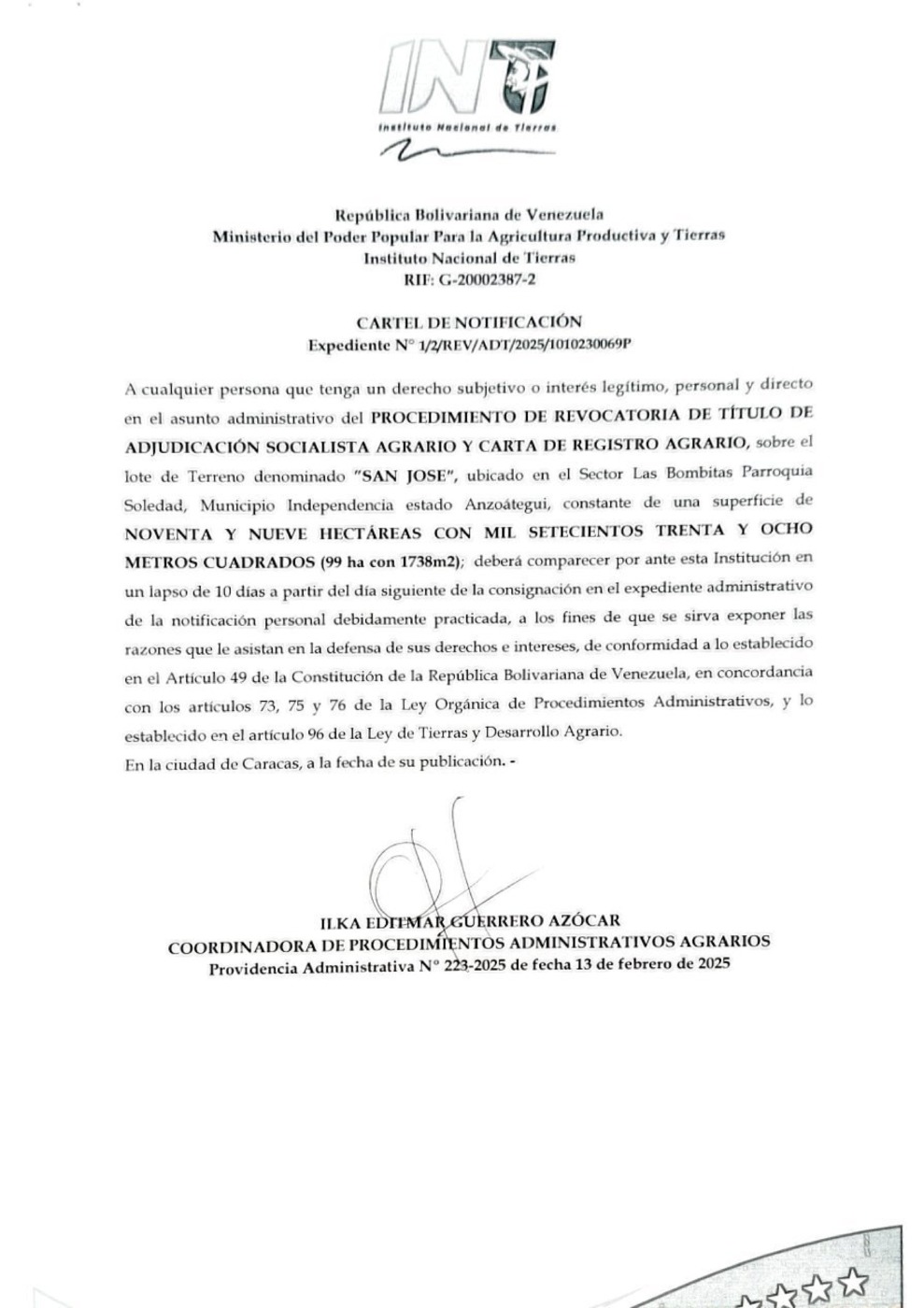 El INTI, Instituto Nacional de Tierras, emitió un Cartel de Notificación en relación al Procedimiento de Revocatoria de Título de Adjudicación Socialista Agrario y Carta de Registro Agrario, sobre el lote de terreno denominado «San José», ubicado en el sector Las Bombitas, parroquia Soledad, municipio Independencia del estado Anzoátegui. El documento está suscrito por Ilka Guerrero Azócar, coordinadora de procedimientos administrativos agrarios.