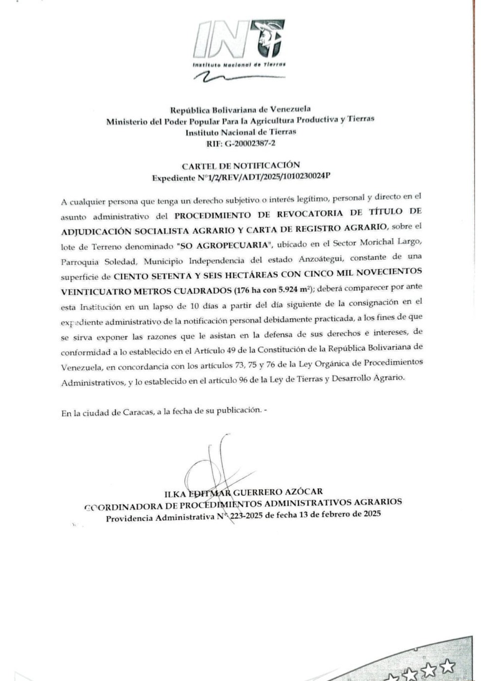 El INTI, Instituto Nacional de Tierras, emitió un Cartel de Notificación en relación al Procedimiento de Revocatoria de Título de Adjudicación Socialista Agrario y Carta de Registro Agrario, sobre el lote de terreno denominado «So Agropecuaria», ubicado en el sector Morichal Largo, parroquia Soledad, municipio Independencia del estado Anzoátegui. El documento está suscrito por Ilka Guerrero Azócar, coordinadora de procedimientos administrativos agrarios.