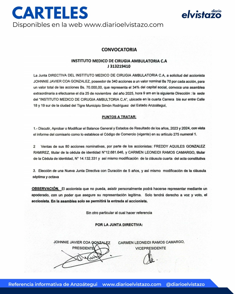 La Junta DIRECTIVA DEL INSTITUTO MEDICO DE CIRUGÍA AMBULATORIA C.A, a solicitud del accionista JOHNNIE JAVIER COA GONZALEZ, poseedor de 340 acciones, que representa el 34% del capital social, convoca una Asamblea Extraordinaria a efectuarse el día 25 de noviembre del año 2025, hora 9:00 am en la siguiente Dirección: la sede del “INSTITUTO MEDICO DE CIRUGÍA AMBULATORIA C.A.”, ubicada en la cuarta Carrera bís sur entre Calle 18 y 19 sur de la ciudad de El Tigre, municipio Simón Rodríguez del Estado Anzoátegui.