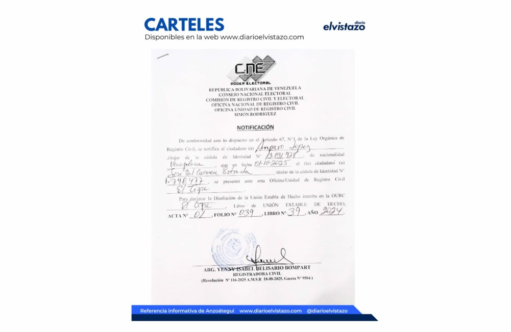 La Oficina Unidad de Registro Civil del municipio Simón Rodríguez, dirigida por la abogada Margreiz del Carmen Medina Gómez, emitió una notificación de fecha 10 de marzo de 2025, en atención a los ciudadanos Dubraska González, titular de la cédula de identidad N° 12.512.189 y Jesús Miguel Berroterán Ramírez, titular de la cédula de identidad N° 8.998.713 Asunto: Disolución de la Unión Estable de Hecho.
