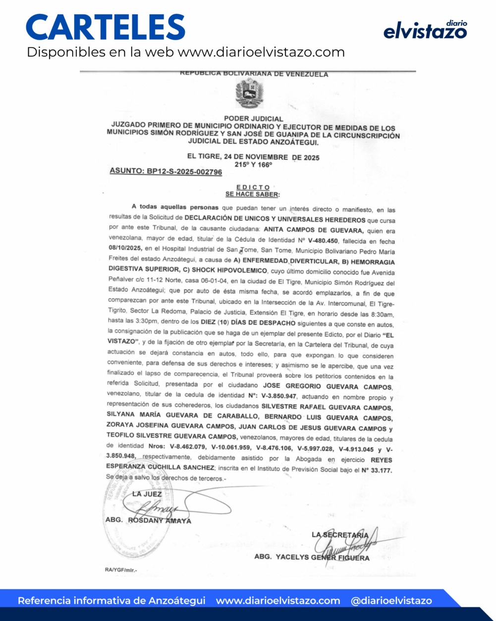 El Juzgado Primero de Municipio Ordinario y Ejecutor de Medidas de los Municipios Simón Rodríguez y San José de Guanipa de la Circunscripción Judicial del estado Anzoátegui, dirigido por la jueza Abg. Rosdany Amaya, emitió un Edicto de fecha 24 de noviembre de 2025, en atención a todas aquellas personas que puedan tener un interés directo o manifiesto en las resultas de la solicitud de Declaración de Únicos y Universales Herederos que cursa por ante este tribunal, de la causante ciudadana Anita Campos de Guevara, quien era venezolana, mayor de edad, cédula de identidad 480.450, fallecida en fecha 08/10/2025 en el hospital Industrial de San Tomé, municipio Pedro María Freites de Anzoátegui, a causa de A) Enfermedad Diverticular, B) Hemorragia digestiva superior C) Shock Hipovolémico.