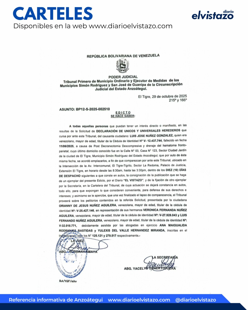 El Juzgado Primero de Municipio Ordinario y Ejecutor de Medidas de los Municipios Simón Rodríguez y San José de Guanipa de la Circunscripción Judicial del estado Anzoátegui, dirigido por la jueza Abg. Rosdany Amaya, emitió un Edicto de fecha 29 de octubre de 2025, en atención a todas aquellas personas que puedan tener un interés directo o manifiesto en las resultas de la solicitud de Declaración de Únicos y Universales Herederos que cursa por ante este tribunal, del causante ciudadano Luis José Núñez González, quien era venezolano, mayor de edad, cédula de identidad 12.437.744, fallecido en fecha 11/06/2025 a causa de Post Decraneotomía Descompresiva y Drenaje del Hematoma Frontoparietal.