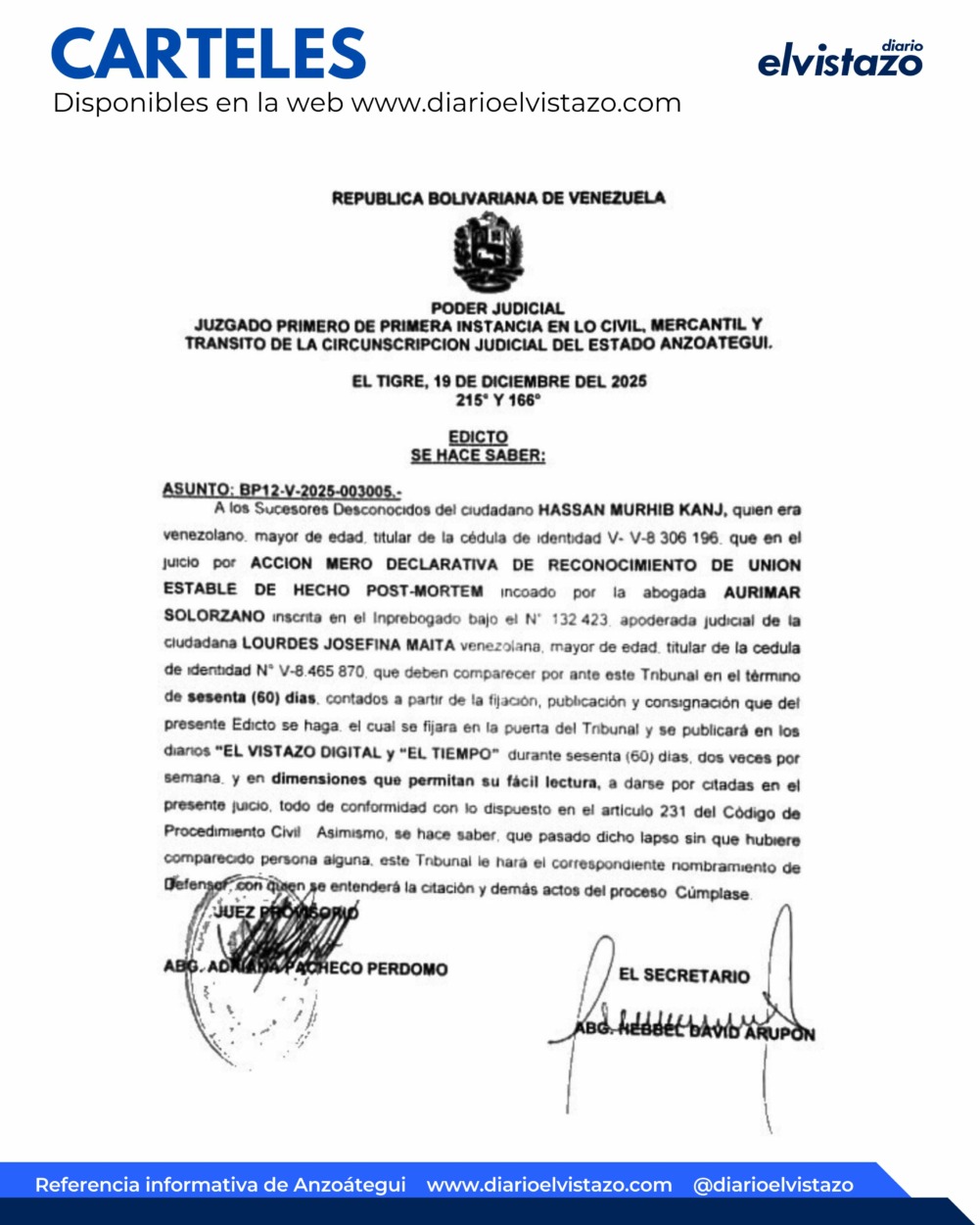 El Juzgado Primero de Primera instancia en lo Civil, Mercantil y Tránsito de la Circunscripción Judicial de El Tigre, estado estado Anzoátegui, dirigido por la juez Adriana Pacheco Perdomo, emitió un Edicto de fecha 19 de diciembre de 2025, en atención a los sucesores desconocidos del ciudadano Hassan Murhib Kanj, quien era venezolano, mayor de edad, titular de la cédula de identidad V-8.306.196. Asunto: Acción Mero Declarativa de Reconocimiento de Unión Estable de Hecho post-mortem.