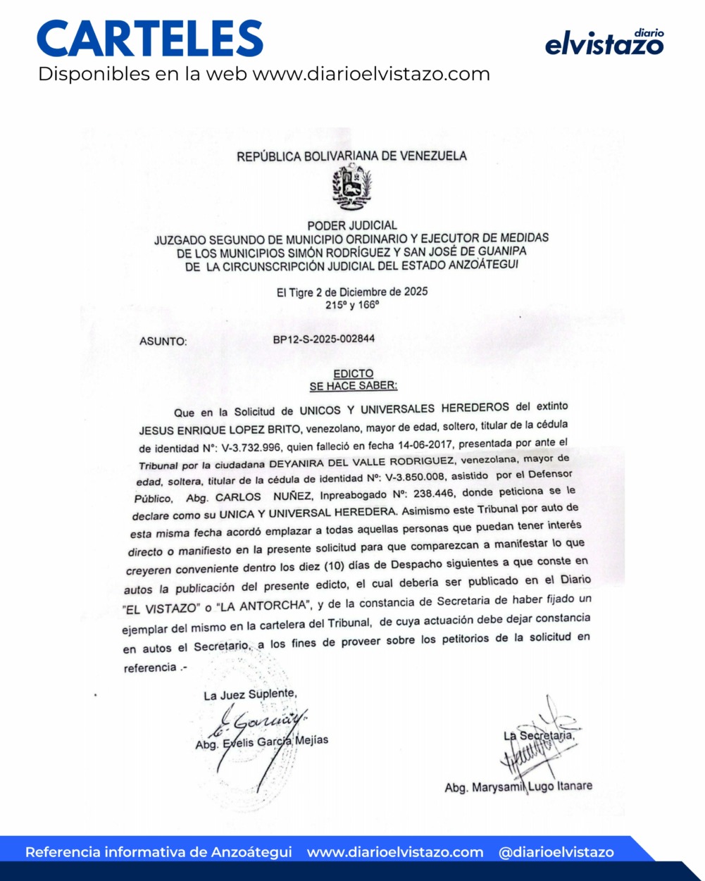 El Juzgado Segundo de municipio ordinario y ejecutor de medidas de los municipios Simón Rodríguez y San José de Guanipa, de la Circunscripción Judicial del Estado Anzoátegui, dirigido por la jueza Evelis García Mejías, emitió un Edicto de fecha 2 de Diciembre de 2025, en atención a la Solicitud de Únicos y Universales Herederos del extinto Jesús Enrique López Brito, venezolano, mayor de edad, soltero, titular de la cédula N° V- 3.732.996 quien falleció el 14/06/2017.