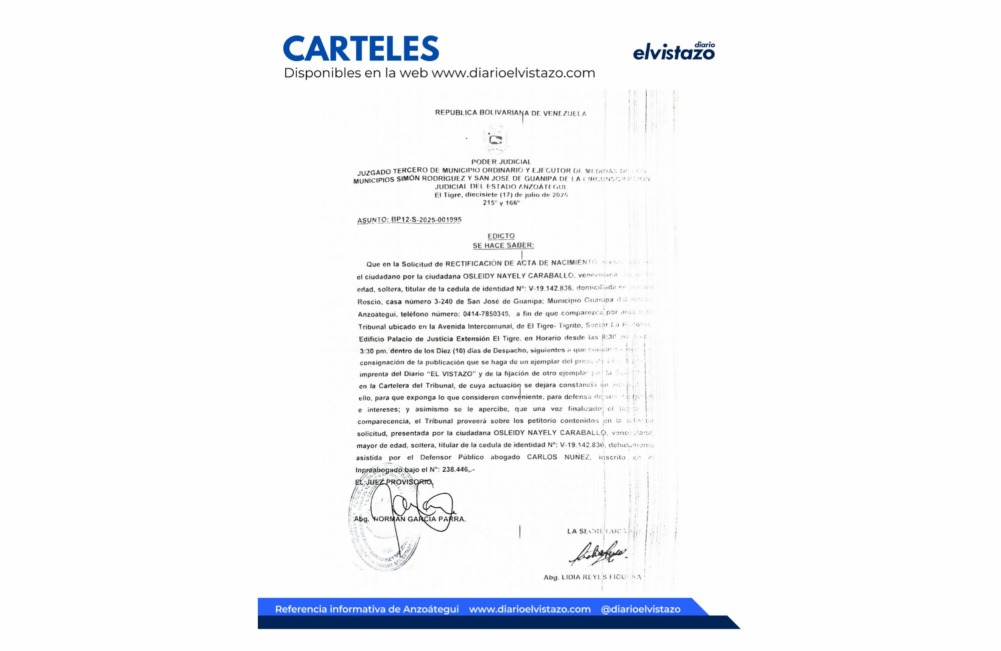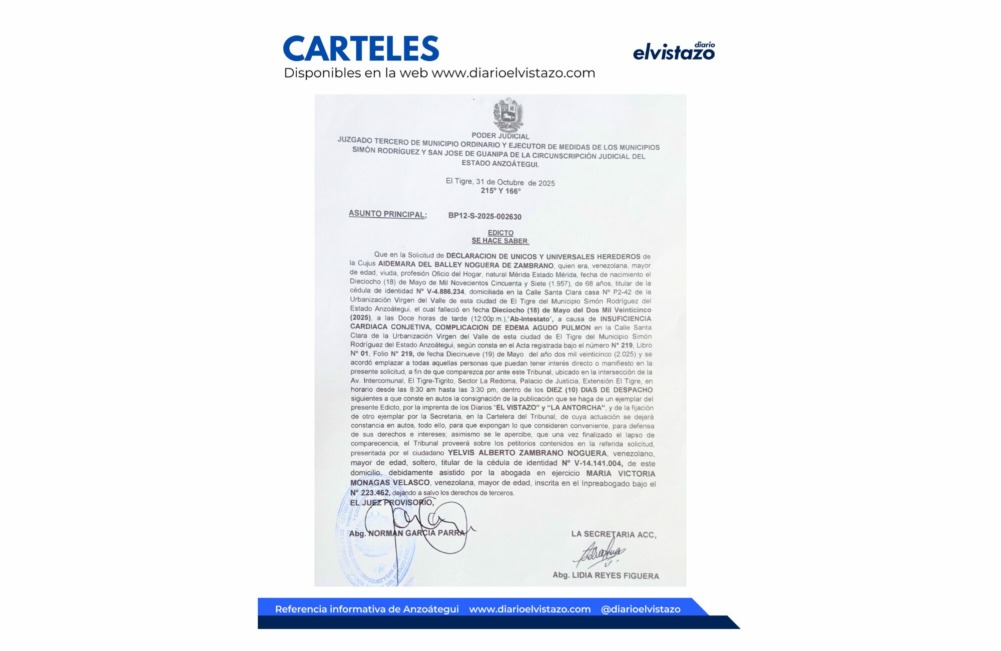 El Juzgado Segundo de municipio ordinario y ejecutor de medidas de los municipios Simón Rodríguez y San José de Guanipa, de la Circunscripción Judicial del Estado Anzoátegui, dirigido por la jueza Gladys Margarita León Lárez, emitió un Edicto de fecha 2 de diciembre de 2024, en atención a la solicitud de Únicos y Universales Herederos del extinto José del Carmen Salazar Gómez, venezolano, mayor de edad, titular de la cédula de identidad N° V- 3.730.590, fallecido en fecha 14/02/2020 en El Tigre, municipio Simón Rodríguez del estado Anzoátegui.