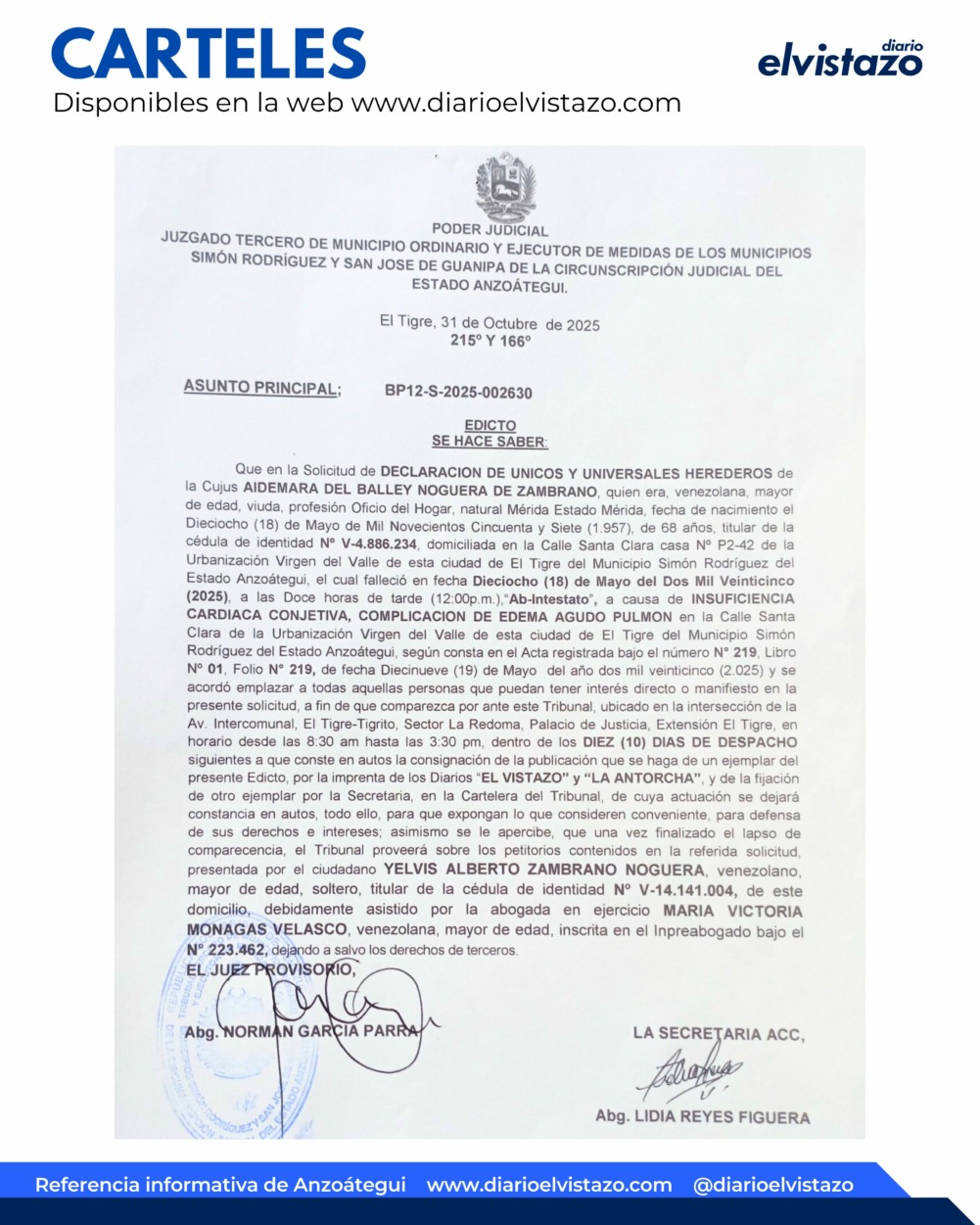 El Juzgado Tercero de Municipio Ordinario y Ejecutor de Medidas de los Municipios Simón Rodríguez y San José de Guanipa de la Circunscripción Judicial del estado Anzoátegui, dirigido por el juez Norman García Parra, emitió un Edicto de fecha 31 de octubre de 2025, por la Solicitud de Declaración de Únicos y Universales Herederos de Aidemara del Balley Noguera de Zambrano, quien era venezolana, mayor de edad, viuda, oficio del hogar, de 68 años, cédula de identidad N° V- 4.886.234, la cual falleció en fecha 18 de mayo de 2025, a causa de Insuficiencia Cardíaca Conjetiva, Complicación de Edema Agudo Pulmón.
