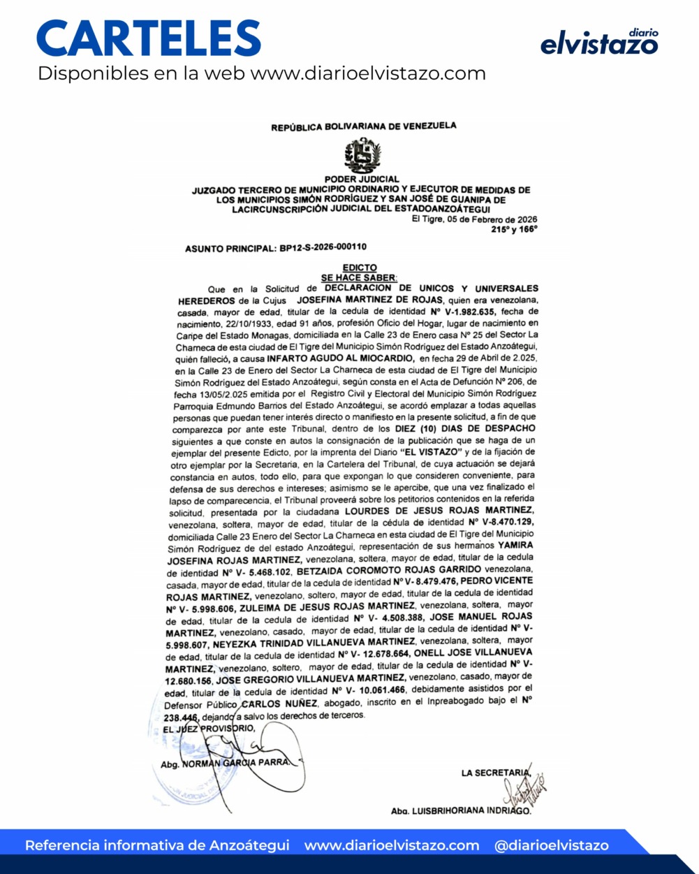 El Juzgado Tercero de Municipio Ordinario y Ejecutor de Medidas de los Municipios Simón Rodríguez y San José de Guanipa de la Circunscripción Judicial del estado Anzoátegui, dirigido por el juez Norman García Parra, emitió un Edicto de fecha 05 de Febrero de 2026, por la Solicitud de Declaración de Únicos y Universales Herederos de Josefina Martínez de Rojas, quien era venezolana, mayor de edad, cédula de identidad N° V- 1.982.635, de 91 años de edad, quién falleció el 29/04/2025 en la calle 23 de Enero del sector La Charneca, El Tigre, municipio Simón Rodríguez de Anzoátegui, a causa de Infarto Agudo al Miocardio.