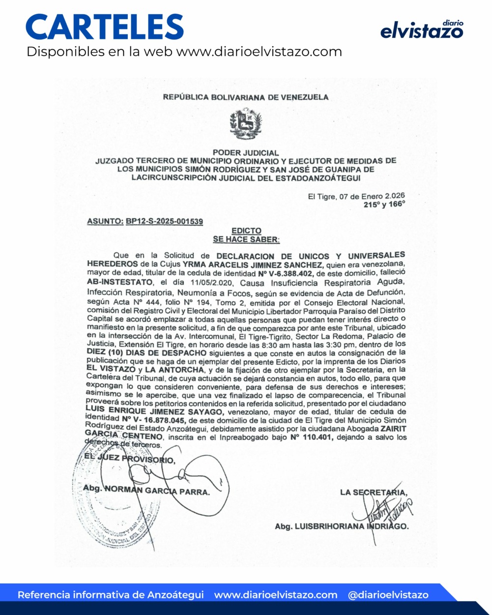 El Juzgado Tercero de Municipio Ordinario y Ejecutor de Medidas de los Municipios Simón Rodríguez y San José de Guanipa de la Circunscripción Judicial del estado Anzoátegui, dirigido por el juez Norman García Parra, emitió un Edicto de fecha 7 de enero de 2026 por la Solicitud de Declaración de Únicos y Universales Herederos de Yrma Aracelis Jiminez Sánchez, quien era venezolana, mayor de edad, cédula de identidad N° V- 6.388.402 la cual falleció en fecha 11 de mayo de 2020, a causa de Insuficiencia Respiratoria Aguda, Infección Respiratoria Neumonía a focos.