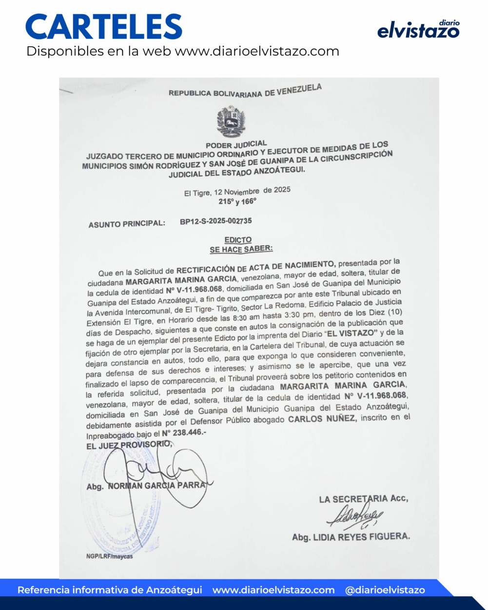 El Juzgado Tercero de Municipio Ordinario y Ejecutor de Medidas de los Municipios Simón Rodríguez y San José de Guanipa de la Circunscripción Judicial del estado Anzoátegui, dirigido por el juez Norman García Parra, emitió un Edicto de fecha 12 de Noviembre de 2025, por la Solicitud de Rectificación de Acta de Nacimiento de Margarita Marina García, venezolana, mayor de edad, cédula de identidad N° V- 11.968.068.