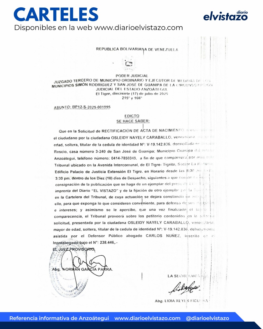 El Juzgado Tercero de Municipio Ordinario y Ejecutor de Medidas de los Municipios Simón Rodríguez y San José de Guanipa de la Circunscripción Judicial del estado Anzoátegui, dirigido por el juez Norman García Parra, emitió un Edicto de fecha 17 de julio de 2025, por la Solicitud de Rectificación de Acta de Nacimiento de Osleidy Nayely Caraballo, venezolana, mayor de edad, cédula de identidad N° V- 19.142.836.