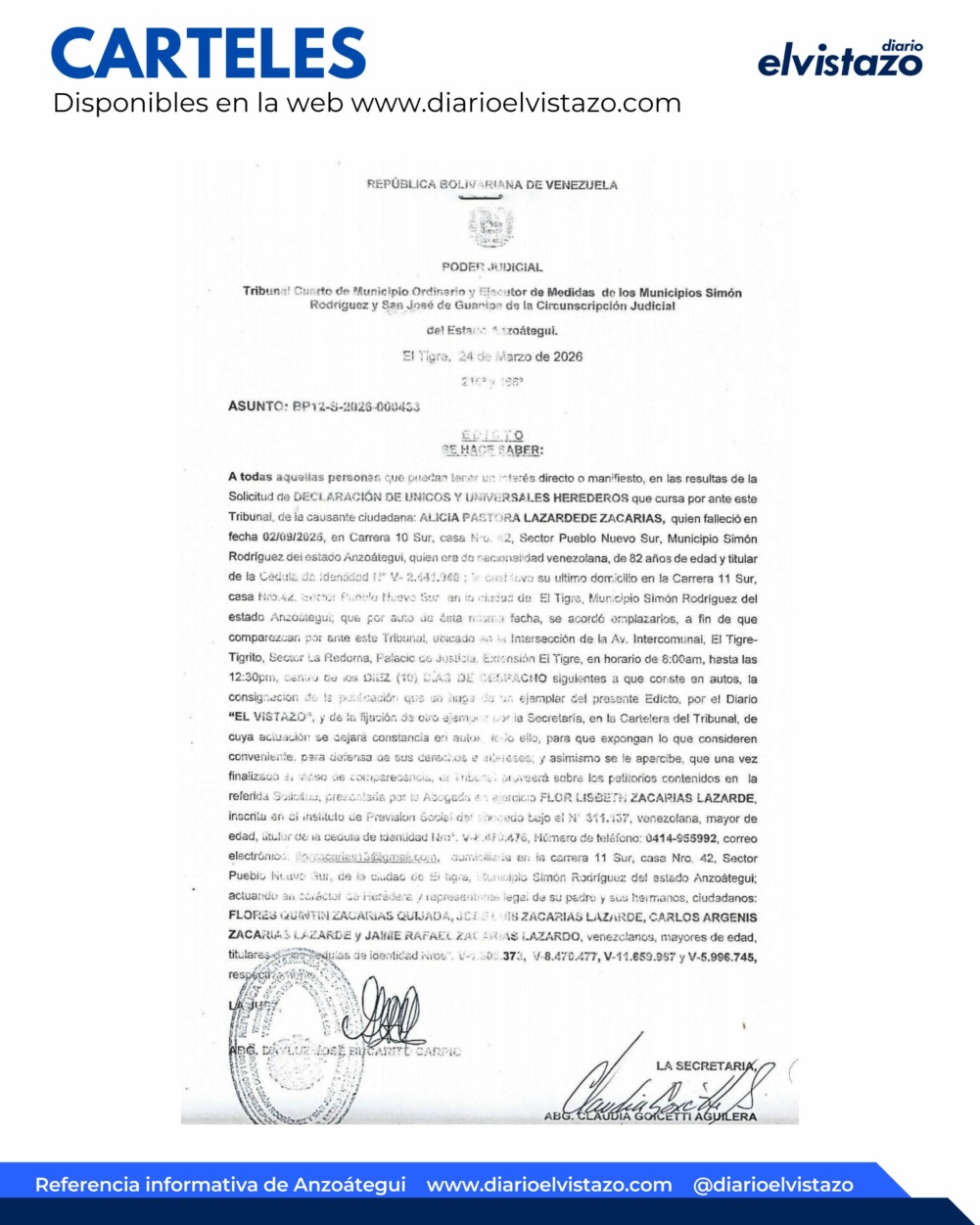 El Tribunal Cuarto de Municipio Ordinario y Ejecutor de Medidas de los Municipios Simón Rodríguez y San José de Guanipa de la Circunscripción Judicial del estado Anzoátegui, dirigido por la jueza Abg. Dayluz Bucarito Carpio, emitió un Edicto de fecha 24 de marzo de 2026, en atención a todas aquellas personas que puedan tener un interés directo o manifiesto en las resultas de la solicitud de Declaración de Únicos y Universales Herederos que cursa por ante este tribunal, de la causante ciudadana Alicia Pastora Lazarde de Zacarías, quien falleció el 02/09/2026 en Carrera 10 Sur, sector Pueblo Nuevo Sur, municipio Simón Rodríguez del estado Anzoátegui, quien era venezolana, de 82 años de edad.