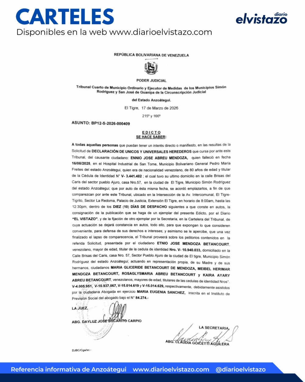 El Tribunal Cuarto de Municipio Ordinario y Ejecutor de Medidas de los Municipios Simón Rodríguez y San José de Guanipa de la Circunscripción Judicial del estado Anzoátegui, dirigido por la jueza Abg. Dayluz Bucarito Carpio, emitió un Edicto de fecha 17 de marzo de 2026, en atención a todas aquellas personas que puedan tener un interés directo o manifiesto en las resultas de la solicitud de Declaración de Únicos y Universales Herederos que cursa por ante este tribunal, del causante ciudadano Ennio José Abreu Mendoza, quien falleció el 16/08/2025 en el hospital Industrial de San Tomé, municipio Pedro María Freites del estado Anzoátegui, quien era venezolano, de 80 años de edad, titular de la cédula de identidad N° V- 3.441.482.