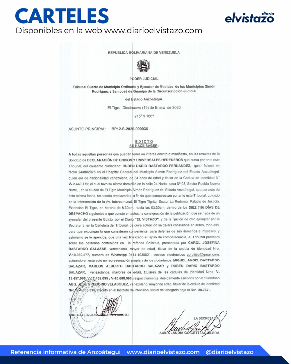 El Tribunal Cuarto de Municipio Ordinario y Ejecutor de Medidas de los Municipios Simón Rodríguez y San José de Guanipa de la Circunscripción Judicial del estado Anzoátegui, dirigido por la jueza Abg. Dayluz Bucarito Carpio, emitió un Edicto de fecha 19 de Enero de 2026, en atención a todas aquellas personas que puedan tener un interés directo o manifiesto en las resultas de la solicitud de Declaración de Únicos y Universales Herederos que cursa por ante este tribunal, del causante ciudadano Rubén Darío Bastardo Fernández, quien falleció el 24/08/2025 en el hospital general de El Tigre, municipio Simón Rodríguez del estado Anzoátegui, quien era venezolano, de 84 años de edad, titular de la cédula de identidad N° V-2.440.779.