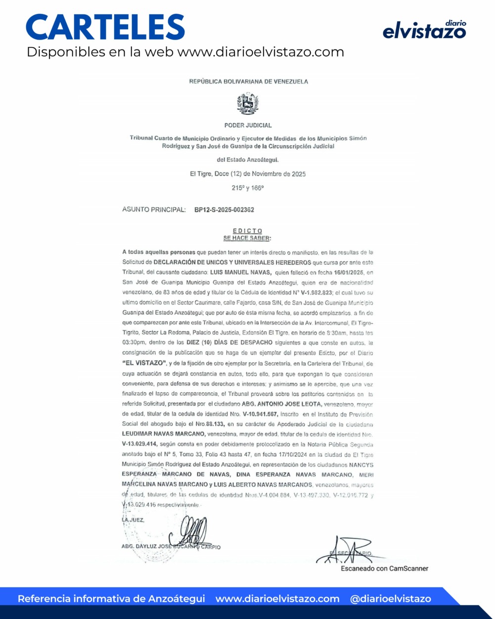 El Tribunal Cuarto de Municipio Ordinario y Ejecutor de Medidas de los Municipios Simón Rodríguez y San José de Guanipa de la Circunscripción Judicial del estado Anzoátegui, dirigido por la jueza Abg. Dayluz Bucarito Carpio, emitió un Edicto de fecha 12 de noviembre de 2025, en atención a todas aquellas personas que puedan tener un interés directo o manifiesto en las resultas de la solicitud de Declaración de Únicos y Universales Herederos que cursa por ante este tribunal, del causante ciudadano Luis Manuel Navas, quien falleció el 16/01/2025 en San José de Guanipa, municipio Guanipa del estado Anzoátegui, quien era venezolano, de 83 años de edad, titular de la cédula de identidad N° V-1.982.823.