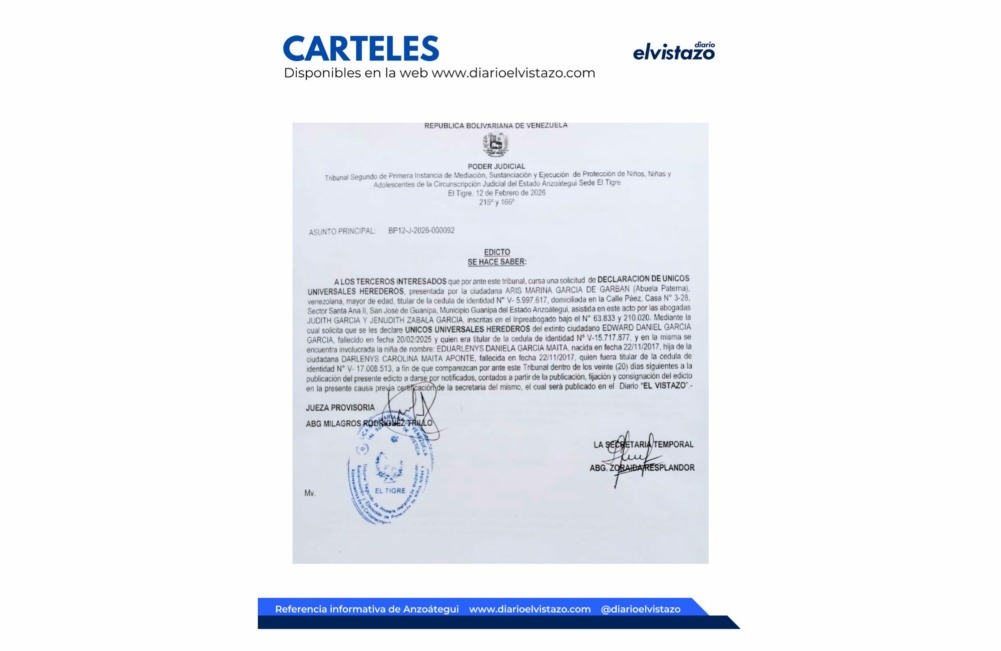 El Tribunal Cuarto de Municipio Ordinario y Ejecutor de Medidas de los Municipios Simón Rodríguez y San José de Guanipa de la Circunscripción Judicial del estado Anzoátegui, dirigido por la jueza Abg. Dayluz Bucarito Carpio, emitió un Edicto de fecha 8 de noviembre de 2024, en atención todas aquellas personas que puedan tener un interés directo o manifiesto en las resultas de la solicitud de Declaración de Únicos y Universales Herederos que cursa por ante este tribunal, del causante ciudadano Luis Antonio Da Silva Quiroz, quien falleció en fecha 04/03/2024 en la Av. Fernández Padilla de San José de Guanipa, municipio Guanipa del estado Anzoátegui, quien era de nacionalidad venezolano, de 64 años de edad, de ocupación comerciante, titular de la cédula de identidad N° 8.004.232, cuyo último domicilio conocido fue en la calle Central, casa M-2, Urbanización El Portal Plaza de la ciudad de El Tigre, municipio Simón Rodríguez del Estado Anzoátegui.