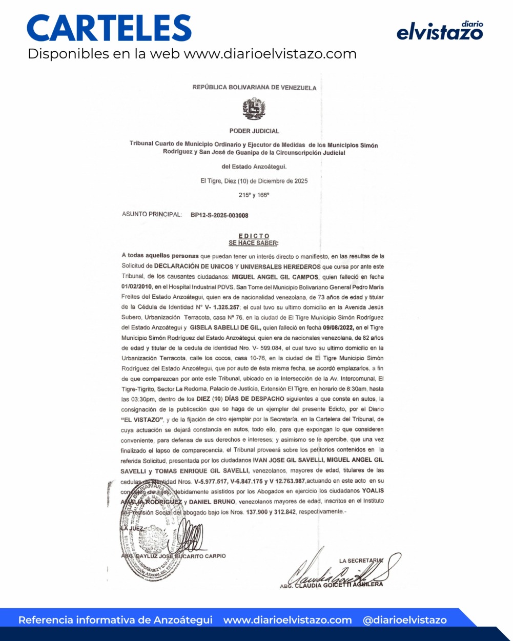 El Tribunal Cuarto de Municipio Ordinario y Ejecutor de Medidas de los Municipios Simón Rodríguez y San José de Guanipa de la Circunscripción Judicial del estado Anzoátegui, dirigido por la jueza Abg. Dayluz Bucarito Carpio, emitió un Edicto de fecha 10 de diciembre de 2025 en atención a todas aquellas personas que puedan tener un interés directo o manifiesto en las resultas de la solicitud de Declaración de Únicos y Universales Herederos que cursa por ante este tribunal de los ciudadanos:
