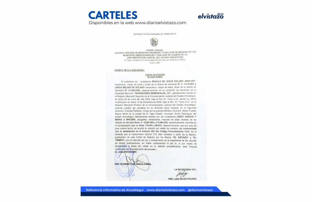 El Tribunal de Municipio Ordinario y Ejecutor de Medidas del Municipio José Gregorio Monagas de la Circunscripción Judicial del estado Anzoátegui, dirigido por la jueza Leandra Pereira, emitió un Edicto de fecha 17 de septiembre de 2024, en atención a la solicitud de Únicos y Universales Herederos del extinto ciudadano Ramón Adolfo León Tovar, quien era venezolano, titular de la cédula de identidad N° V-2.181.331, fallecido en fecha 25/01/2011 en la parroquia Piar, Santa Cruz del Orinoco, municipio José Gregorio Monagas del estado Anzoátegui. La solicitud es formulada por el ciudadano Ramón Abigail León Coraspe, venezolano, mayor de edad, titular de la cédula de identidad N° V-8.485.456.