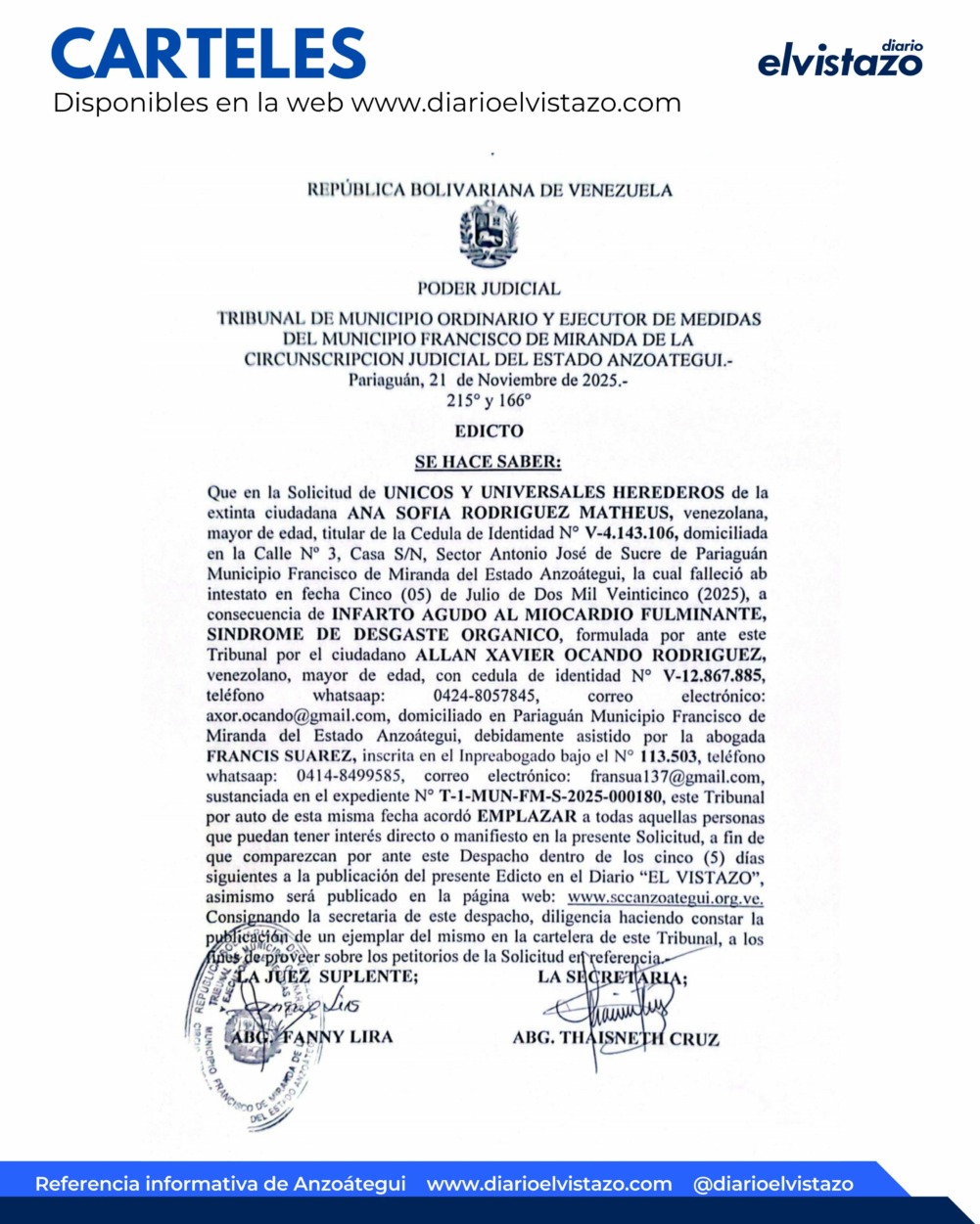 El Tribunal de Municipio Ordinario y Ejecutor de Medidas del Municipio Francisco de Miranda de la Circunscripción Judicial del estado Anzoátegui, Pariaguán, dirigido por la jueza Abg. Fanny Lira, emitió un Edicto de fecha 21 de noviembre de 2025, en atención a todas aquellas personas que puedan tener interés directo o manifiesto en la presente solicitud de Únicos y Universales Herederos de la extinta ciudadana Ana Sofía Rodríguez Matheus, venezolana, mayor de edad, titular de la cédula de identidad N° V – 4.143.106 la cual falleció en fecha 05/07/2025 a consecuencia de Infarto al Miocardio fulminante, síndrome de desgaste orgánico.