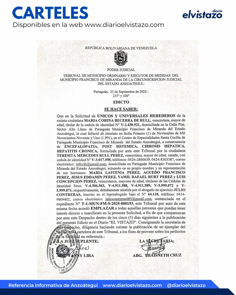 El Tribunal de Municipio Ordinario y Ejecutor de Medidas del Municipio Francisco de Miranda de la Circunscripción Judicial del estado Anzoátegui, Pariaguán, dirigido por la jueza Abg. Fanny Lira, emitió un Edicto de fecha 23 de septiembre de 2025, en atención a todas aquellas personas que puedan tener interés directo o manifiesto en la presente solicitud de Únicos y Universales Herederos de la extinta ciudadana María Corina Becerra de Rull, venezolana, mayor de edad, titular de la cédula de identidad N° V – 2.430.921 la cual falleció en fecha 01/11/1991 en el Centro de Especialidades Santa Cecilia de Pariaguán municipio Francisco de Miranda del estado Anzoátegui, a consecuencia de Encefalopatía post sistémica, Cirrosis Hepática, Hepatitis Crónica.