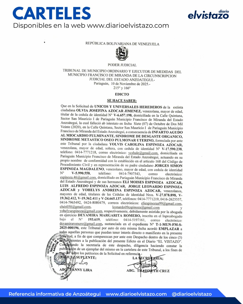 El Tribunal de Municipio Ordinario y Ejecutor de Medidas del Municipio Francisco de Miranda de la Circunscripción Judicial del estado Anzoátegui, Pariaguán, dirigido por la jueza Abg. Fanny Lira, emitió un Edicto de fecha 10 de noviembre de 2025, en atención a todas aquellas personas que puedan tener interés directo o manifiesto en la presente solicitud de Únicos y Universales Herederos de la extinta ciudadana Olivia Josefina Azócar Jiménez, venezolana, mayor de edad, titular de la cédula de identidad N° V – 6.657.198 la cual falleció en fecha 07/10/2020 a consecuencia de Infarto Agudo al Miocardio fulminante, Síndrome de Desgaste Orgánico, Síndrome Metástico Oseo-Pulmonar-Uterino.