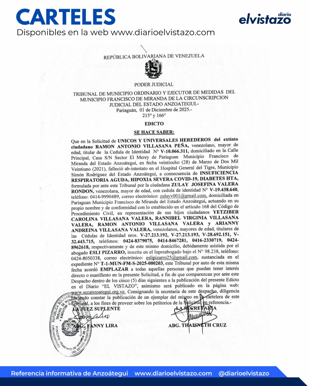 El Tribunal de Municipio Ordinario y Ejecutor de Medidas del Municipio Francisco de Miranda de la Circunscripción Judicial del estado Anzoátegui, Pariaguán, dirigido por la jueza Abg. Fanny Lira, emitió un Edicto de fecha 01 de Diciembre de 2025, en atención a todas aquellas personas que puedan tener interés directo o manifiesto en la presente solicitud de Únicos y Universales Herederos del extinto ciudadano Ramón Antonio Villasana Peña, venezolano, mayor de edad, titular de la cédula de identidad N° V – 10.066.311 quien falleció en fecha 28/03/2021 a consecuencia de Insuficiencia respiratoria aguda, Hipoxia severa COVID-19, Diabetes HTA.