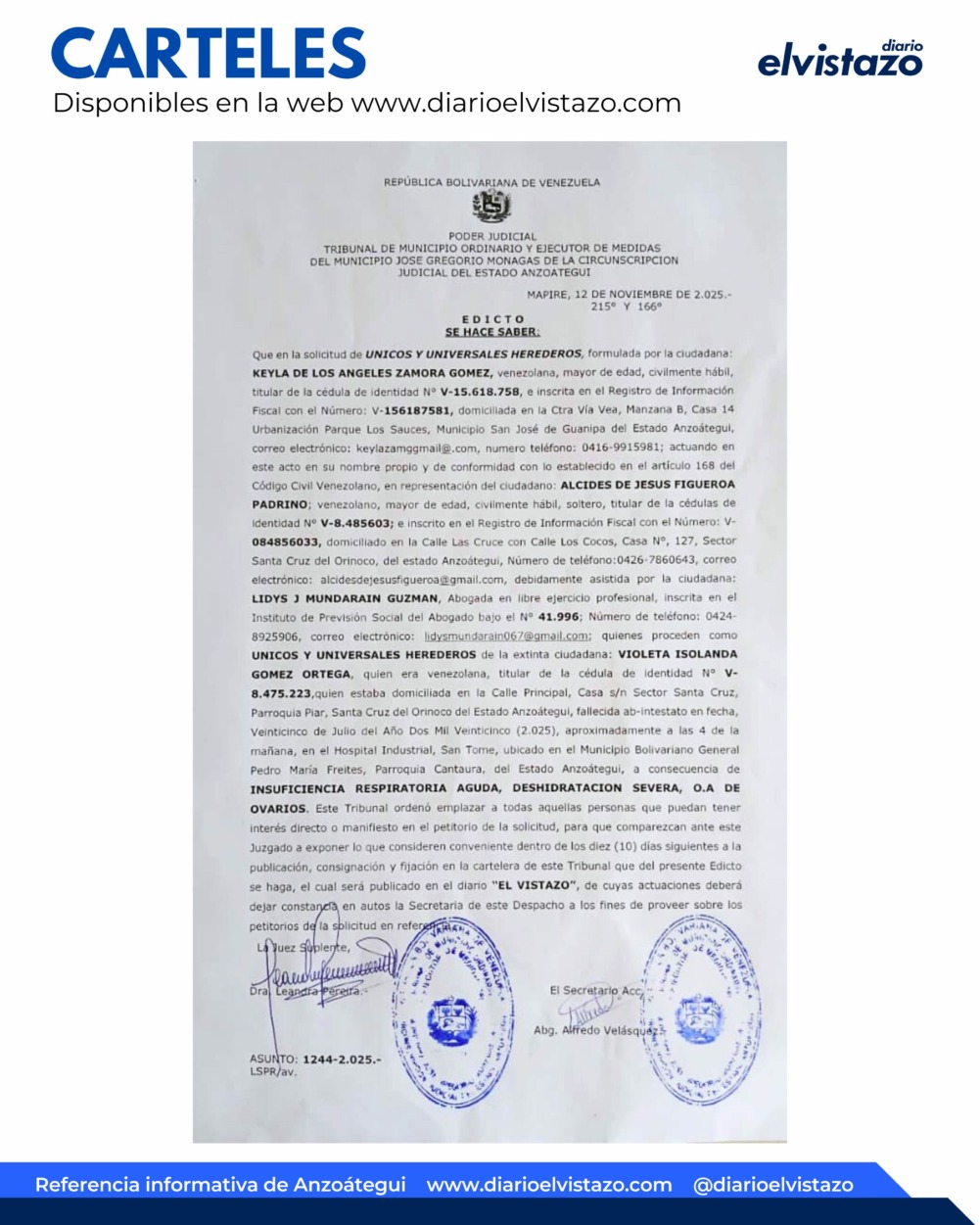 El Tribunal de Municipio Ordinario y Ejecutor de Medidas del Municipio José Gregorio Monagas de la Circunscripción Judicial del estado Anzoátegui, dirigido por la jueza Leandra Pereira, emitió un Edicto de fecha 12 de noviembre de 2024, en atención a la solicitud de Únicos y Universales Herederos de la extinta ciudadana Violeta Isolanda Gómez Ortega, quien era venezolana, titular de la cédula de identidad N° V-8.475.223, fallecido en fecha 25/07/2025 en el Hospital Industrial de San Tomé, municipio Pedro María Freites del estado Anzoátegui.