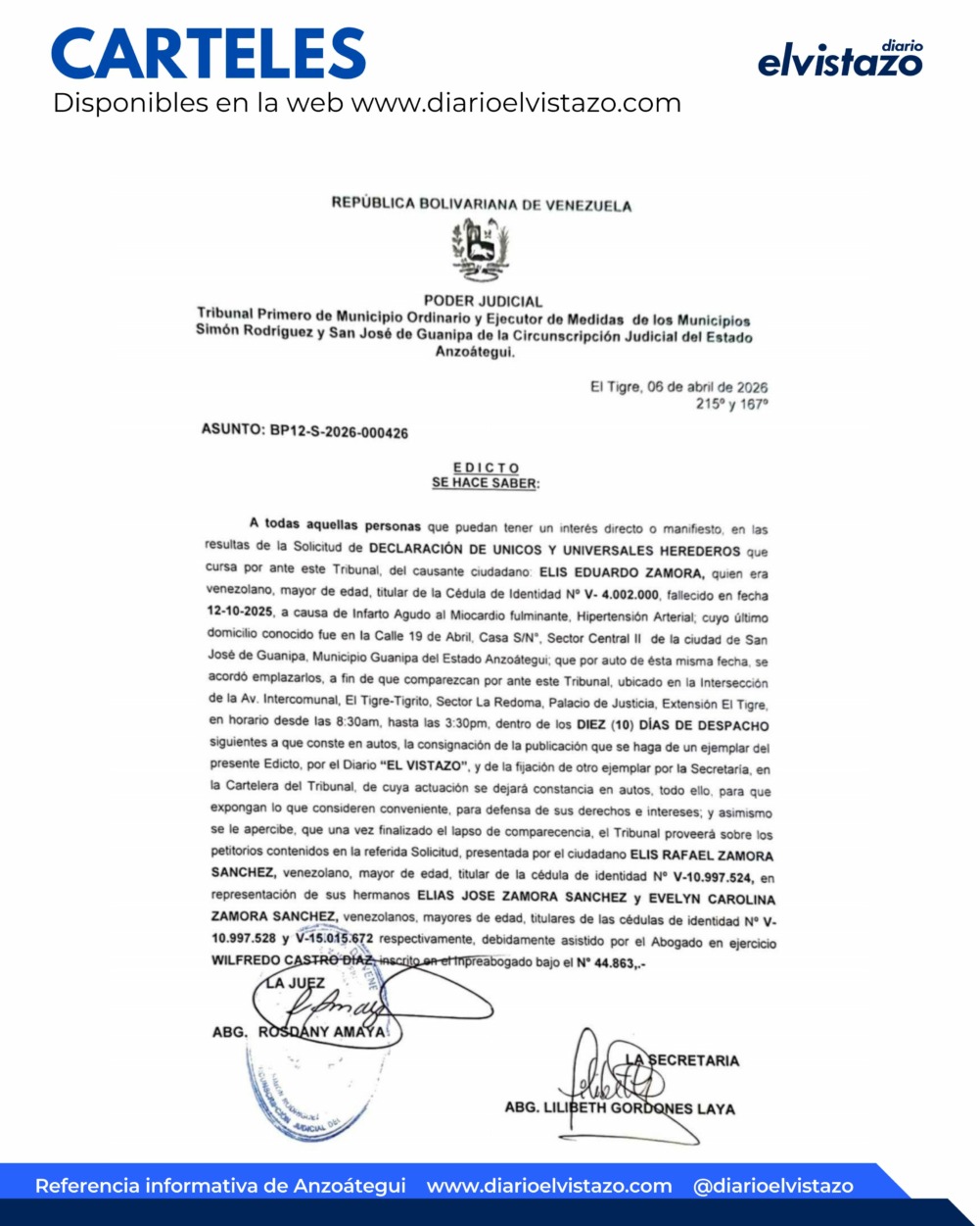 El Tribunal Primero de Municipio Ordinario y Ejecutor de Medidas de los Municipios Simón Rodríguez y San José de Guanipa de la Circunscripción Judicial del estado Anzoátegui, dirigido por la jueza Abg. Rosdany Amaya, emitió un Edicto de fecha 6 de Abril de 2026, en atención a todas aquellas personas que puedan tener un interés directo o manifiesto en las resultas de la solicitud de Declaración de Únicos y Universales Herederos que cursa por ante este tribunal, del causante ciudadano Elis Eduardo Zamora, quien era venezolano, mayor de edad, cédula de identidad 4.002.000 fallecido en fecha 12/10/2025 a causa de falla Infarto Agudo al Miocardio fulminante, Hipertensión Arterial.