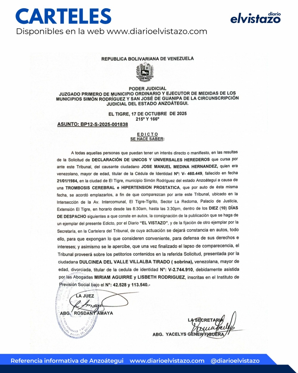 El Tribunal Primero de Municipio Ordinario y Ejecutor de Medidas de los Municipios Simón Rodríguez y San José de Guanipa de la Circunscripción Judicial del estado Anzoátegui, dirigido por la jueza Abg. Rosdany Amaya, emitió un Edicto de fecha 17 de octubre de 2025, en atención a todas aquellas personas que puedan tener un interés directo o manifiesto en las resultas de la solicitud de Declaración de Únicos y Universales Herederos que cursa por ante este tribunal, del causante ciudadano José Manuel Medina Hernández, quien era venezolano, mayor de edad, cédula de identidad 460.449, fallecido en fecha 21/01/1984 a causa de Trombosis Cerebral e Hipertensión Prostática.