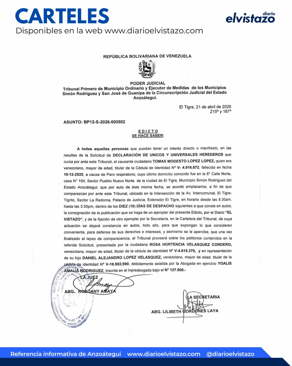 El Tribunal Primero de Municipio Ordinario y Ejecutor de Medidas de los Municipios Simón Rodríguez y San José de Guanipa de la Circunscripción Judicial del estado Anzoátegui, dirigido por la jueza Abg. Rosdany Amaya, emitió un Edicto de fecha 21 de Abril de 2026, en atención a todas aquellas personas que puedan tener un interés directo o manifiesto en las resultas de la solicitud de Declaración de Únicos y Universales Herederos que cursa por ante este tribunal, del causante ciudadano Tomás Modesto López López, quien era venezolano, mayor de edad, cédula de identidad 4.916.672 fallecido en fecha 10/12/2025 a causa de Paro Respiratorio.