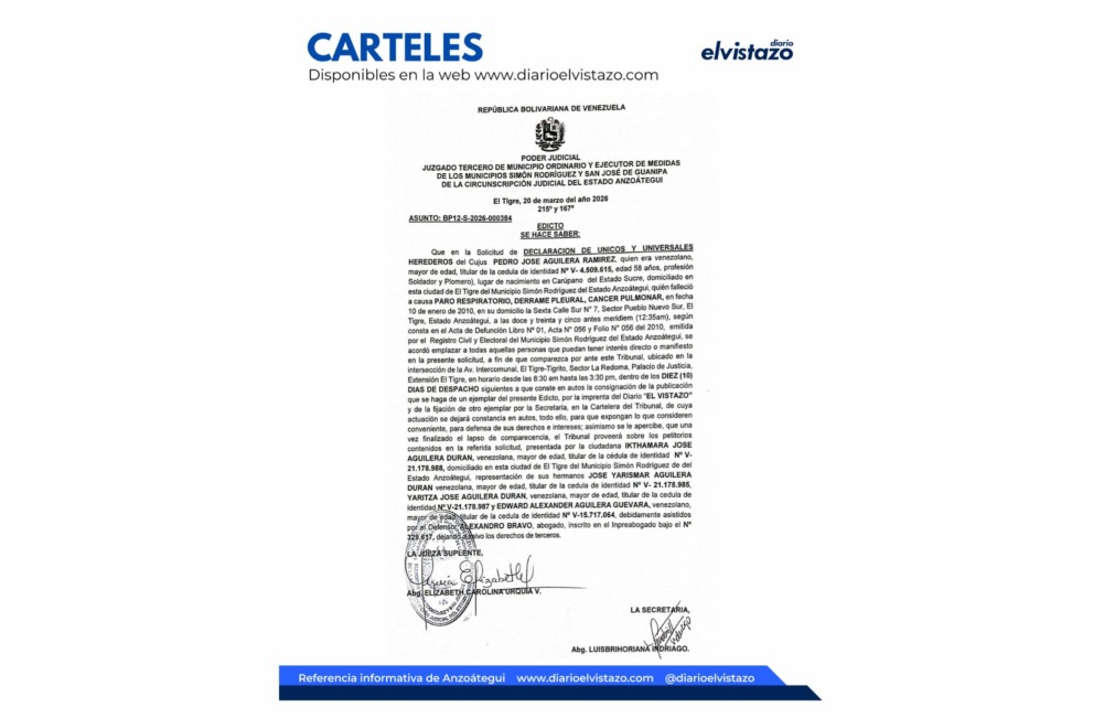 El Tribunal Primero de Municipio Ordinario y Ejecutor de Medidas de los Municipios Simón Rodríguez y San José de Guanipa de la Circunscripción Judicial del estado Anzoátegui, dirigido por la jueza Amarilys Cairo Narváez, emitió un edicto de fecha 14 de junio de 2024, en atención a todas aquellas personas que puedan tener interés directo o manifiesto en las resultas de la solicitud de Declaración de Únicos y Universales Herederos, que cursa ante este tribunal de municipio del extinto ciudadano Noel Rosales, quien era venezolano, mayor de edad, titular de la cédula de identidad N° V-784.828, fallecido en fecha 02/08/2022.