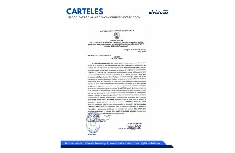 El Tribunal Primero de Municipio Ordinario y Ejecutor de Medidas de los Municipios Simón Rodríguez y San José de Guanipa de la Circunscripción Judicial del estado Anzoátegui, dirigido por la jueza Amarilys Cairo Narváez emitió un Edicto de fecha 14 de enero de 2025 en atención a todas aquellas personas que puedan tener interés directo o manifiesto en la Solicitud de Título Supletorio de Vehículo, presentada por el ciudadano Andrés Enrique Marín Marcano, venezolano, mayor de edad, titular de la cédula de identidad N° 16.250.379 con domicilio en la calle 1° de mayo, sector Central III, casa S/N° San José de Guanipa, municipio Guanipa del estado Anzoátegui, sobre un vehículo marca Daewoo, modelo Matiz SE, año 2001, color beige. Todos los detalles en el cartel original a continuación:
