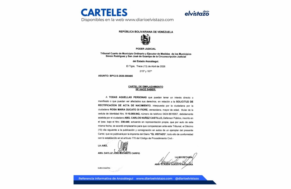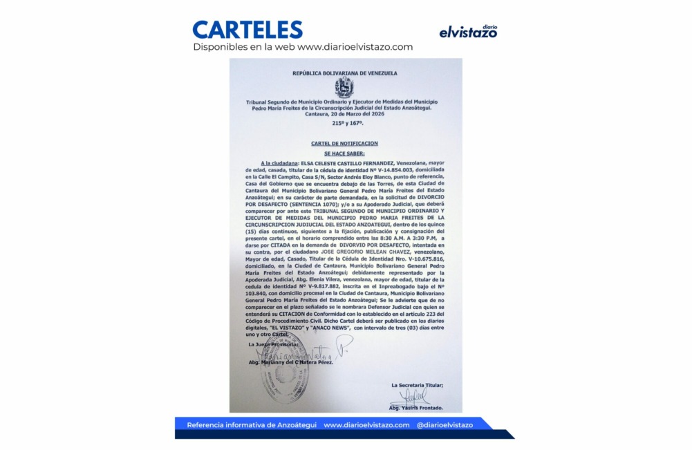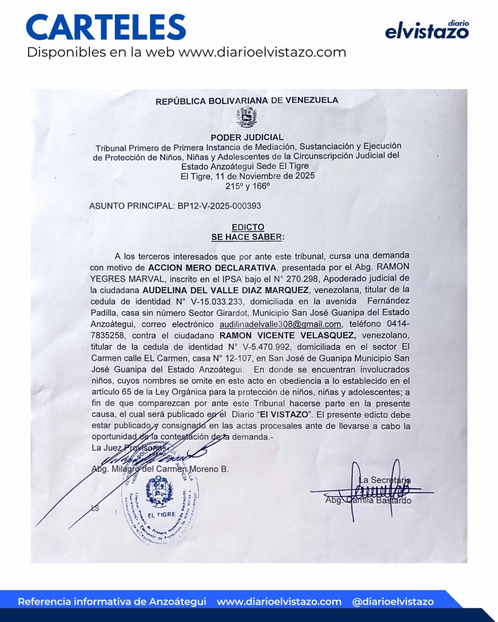 El Tribunal Primero de Primera instancia de Mediación y Sustanciación de Protección de Niños, Niñas y Adolescentes de la Circunscripción Judicial del estado Anzoátegui, sede El Tigre, dirigido por la jueza Milagro Moreno, emitió un Edicto de fecha 11 de noviembre de 2025 en atención a la ciudadana Audelina del Valle Díaz Márquez, venezolana, titular de la cédula de identidad N° V- 15.033.233 y el ciudadano Ramón Vicente Velásquez, venezolano, titular de la cédula de identidad N° V- 5.470.992. Asunto: Demanda de Acción Mero Declarativa.