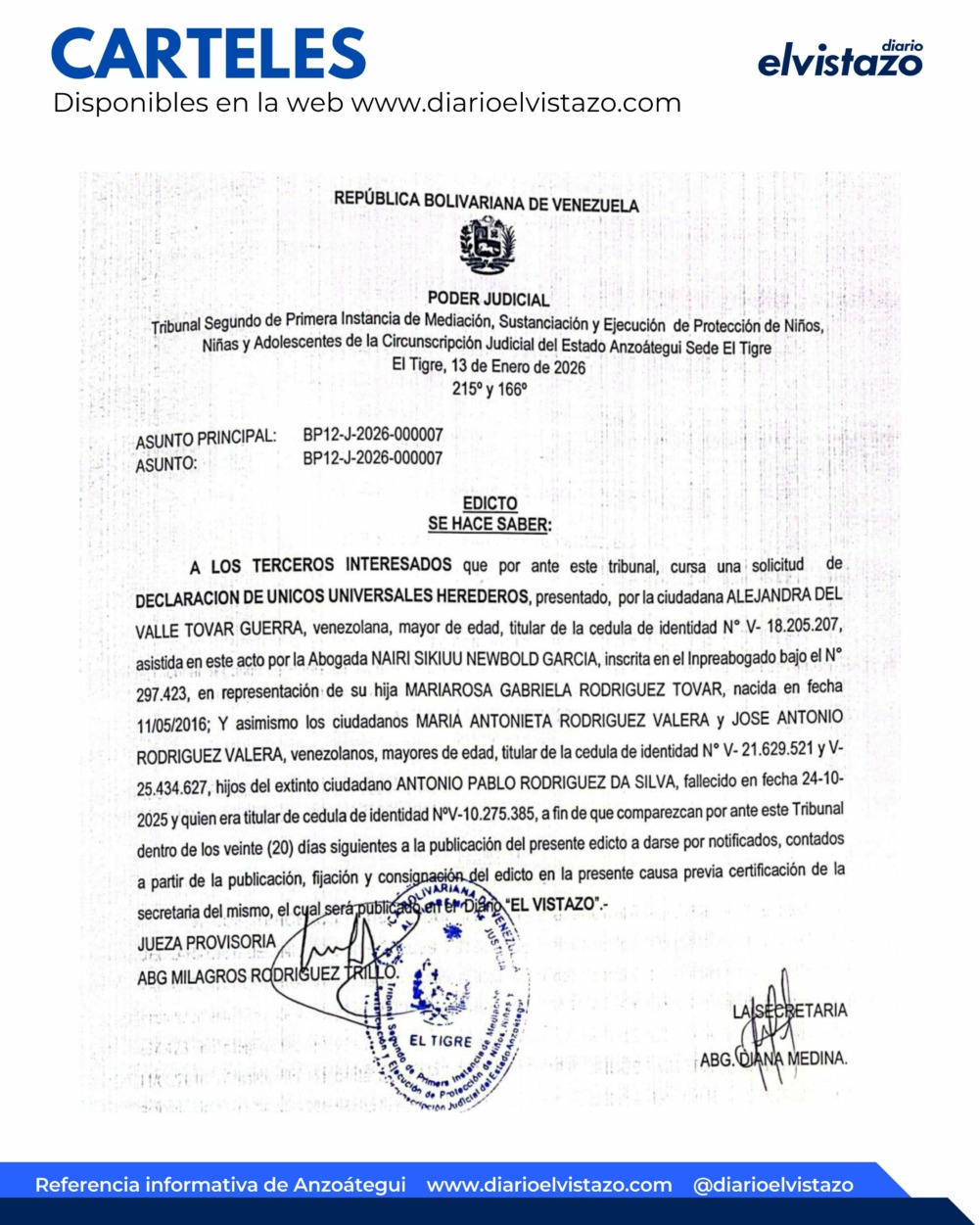 El Tribunal Segundo de Primera Instancia de Mediación y Sustanciación de Protección de Niños, Niñas y Adolescentes de la Circunscripción Judicial del estado Anzoátegui, El Tigre, dirigido por la jueza Milagros Rodríguez Trillo, emitió un Edicto de fecha 13 de Enero de 2026, en atención a los terceros interesados en una solicitud de Declaración de Unicos y Universales Herederos del extinto ciudadano Antonio Pablo Rodríguez Da Silva, quien era venezolano, mayor de edad, titular de la cédula de identidad N° V- 10.275.385 fallecido en fecha 24/10/2025.