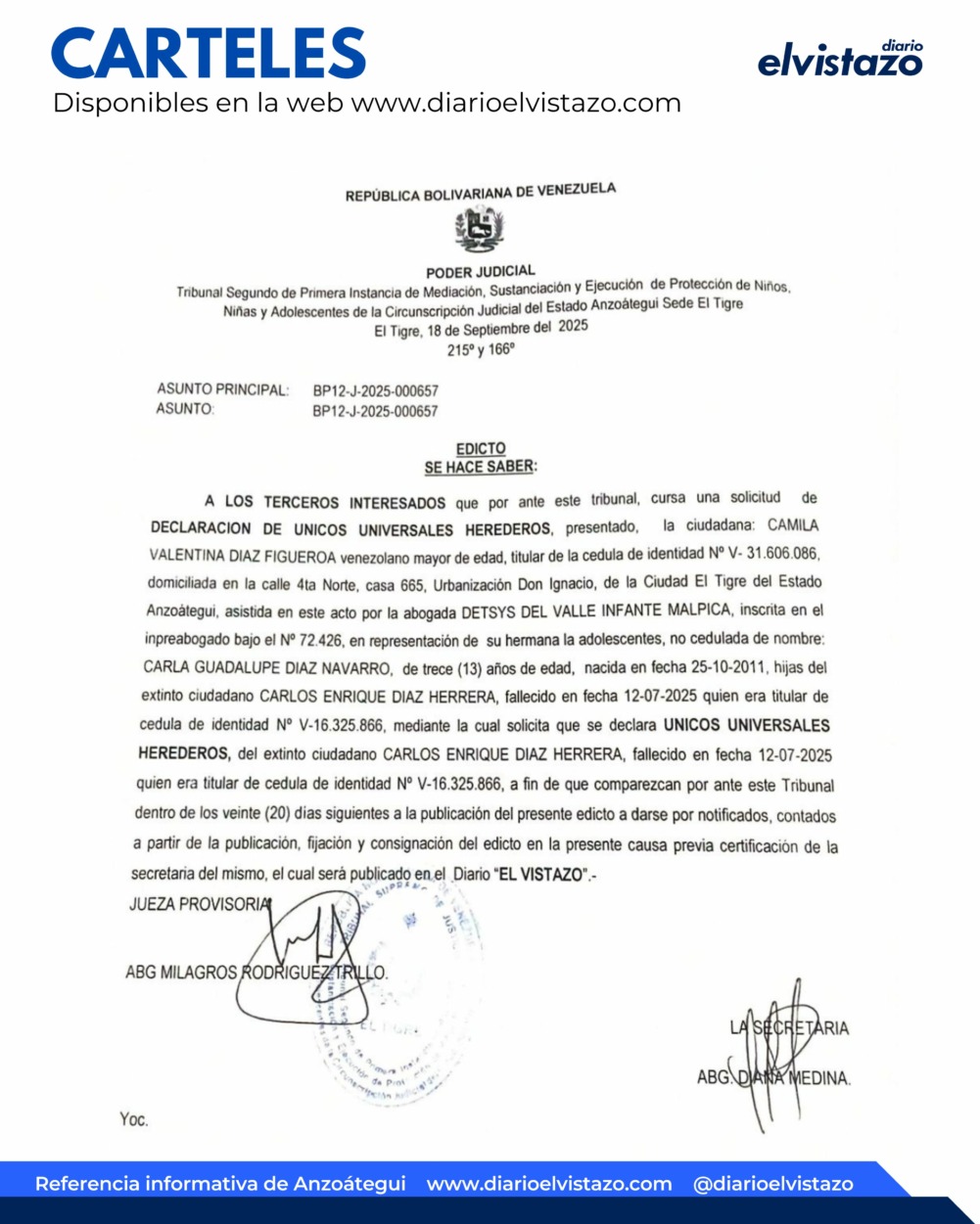Tribunal Segundo de Primera Instancia de Mediación y Sustanciación de Protección de Niños, Niñas y Adolescentes de la Circunscripción Judicial del estado Anzoátegui, El Tigre, dirigido por la jueza Abogada Milagros Rodríguez Trillo, emitió un Edicto de fecha 18 de septiembre de 2025, en atención a los terceros interesados en una solicitud de Declaración de Unicos y Universales Herederos del extinto ciudadano Carlos Enrique Díaz Herrera, quien fuera venezolano, mayor de edad, titular de la cédula de identidad N° V-16.325.866, fallecido en fecha 12/07/2025.