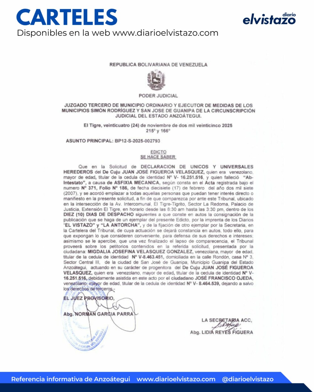 El Juzgado Tercero de Municipio Ordinario y Ejecutor de Medidas de los Municipios Simón Rodríguez y San José de Guanipa de la Circunscripción Judicial del estado Anzoátegui, dirigido por el juez Norman García Parra, emitió un Edicto de fecha 24 de noviembre de 2025, por la Solicitud de Declaración de Únicos y Universales Herederos de Juan José Figueroa Velásquez, quien era venezolano, mayor de edad, cédula de identidad N° V- 16.251.516 el cual falleció en fecha 17 de febrero de 2007.