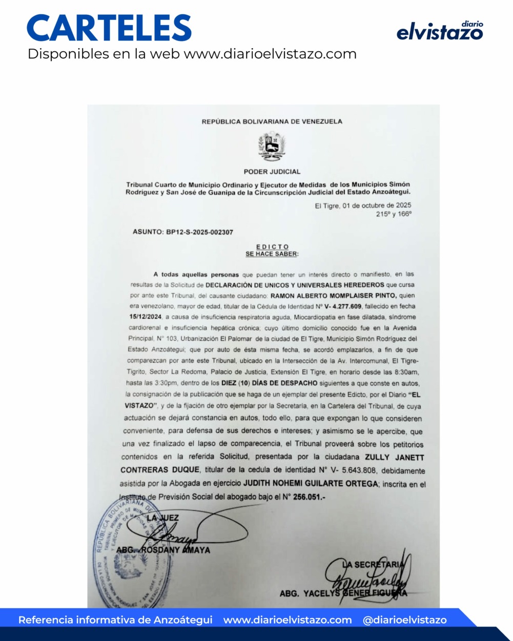 El Tribunal Cuarto de Municipio Ordinario y Ejecutor de Medidas de los Municipios Simón Rodríguez y San José de Guanipa de la Circunscripción Judicial del estado Anzoátegui, dirigido por la jueza Abg. Rosdany Amaya, emitió un Edicto de fecha 01 de octubre de 2025, en atención a todas aquellas personas que puedan tener un interés directo o manifiesto en las resultas de la solicitud de Declaración de Únicos y Universales Herederos que cursa por ante este tribunal, del causante ciudadano Ramón Alberto Momplaiser Pinto, quien era venezolano, mayor de edad, cédula de identidad 4.277.609, fallecido en fecha 15/12/2024 a causa de Insuficiencia respiratoria aguda, miocardiopatía en fase dilatada, Síndrome cardiorenal e Insuficiencia hepática crónica.