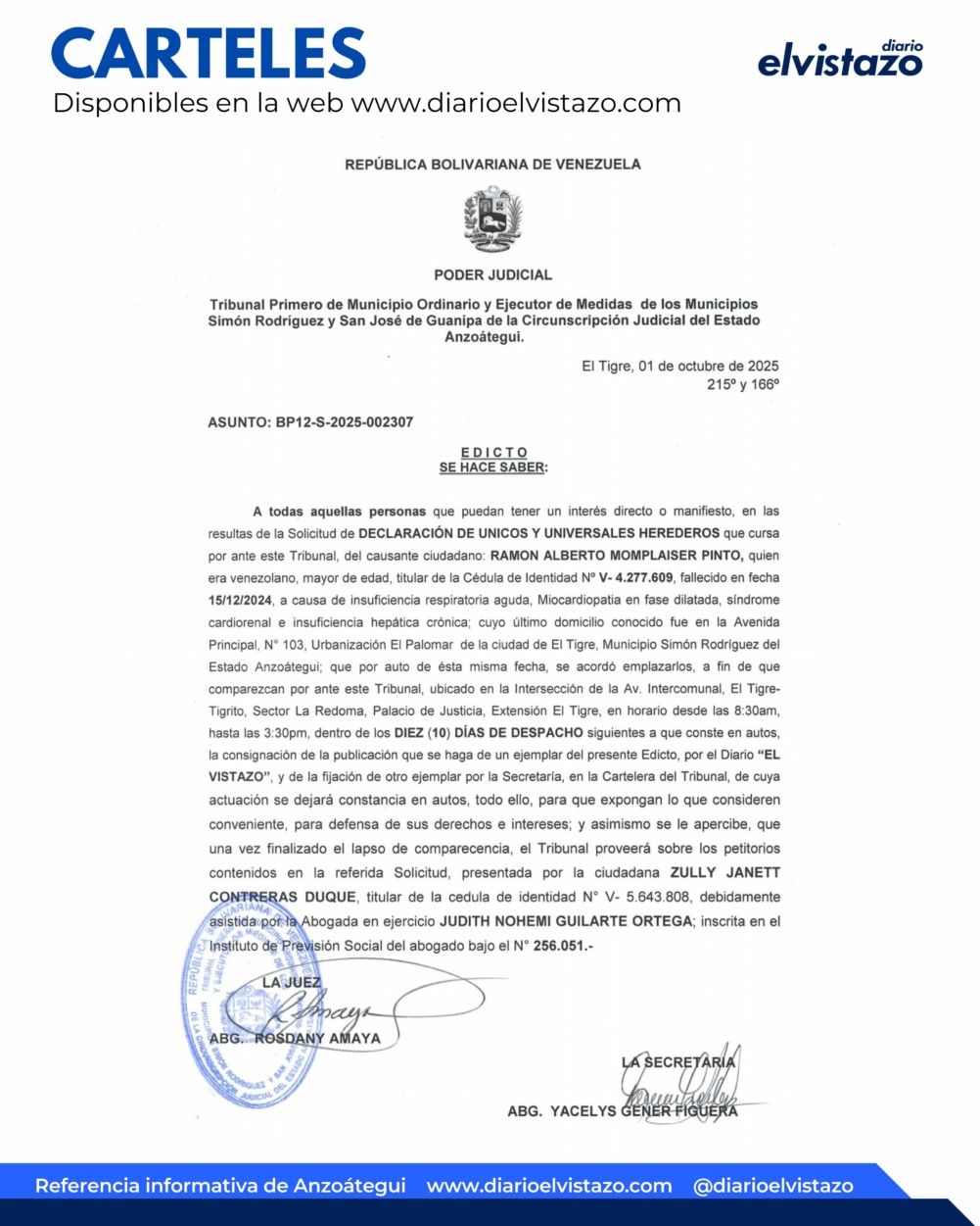 El Tribunal Primero de Municipio Ordinario y Ejecutor de Medidas de los Municipios Simón Rodríguez y San José de Guanipa de la Circunscripción Judicial del estado Anzoátegui, dirigido por la jueza Abg. Rosdany Amaya, emitió un Edicto de fecha 01 de octubre de 2025, en atención a todas aquellas personas que puedan tener un interés directo o manifiesto en las resultas de la solicitud de Declaración de Únicos y Universales Herederos que cursa por ante este tribunal, del causante ciudadano Ramón Alberto Momplaiser Pinto, quien era venezolano, mayor de edad, cédula de identidad 4.277.609, fallecido en fecha 15/12/2024 a causa de Insuficiencia respiratoria aguda, miocardiopatía en fase dilatada, Síndrome cardiorenal e Insuficiencia hepática crónica.
