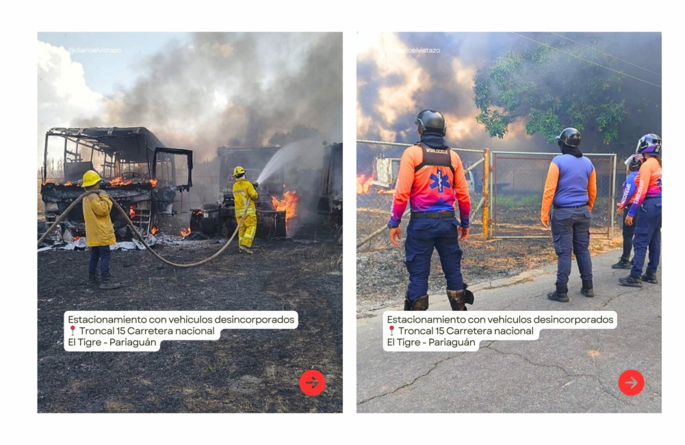 El primero de ellos se registró en la carretera nacional El Tigre – Pariaguán (Troncal 15). Los rescatistas llegaron a eso de las 4:30 pm a un sitio que sirve de estacionamiento bajo arrendamiento de la empresa «Pedro Camejo» donde se vieron afectados cinco vehículos desincorporados, dos tractores Belarus, un chuto Iveco modelo Stralis, un microbús de fabricación rusa marca Kamaz de 23 puestos, y un vehículo utilitario ruso marca Worker.