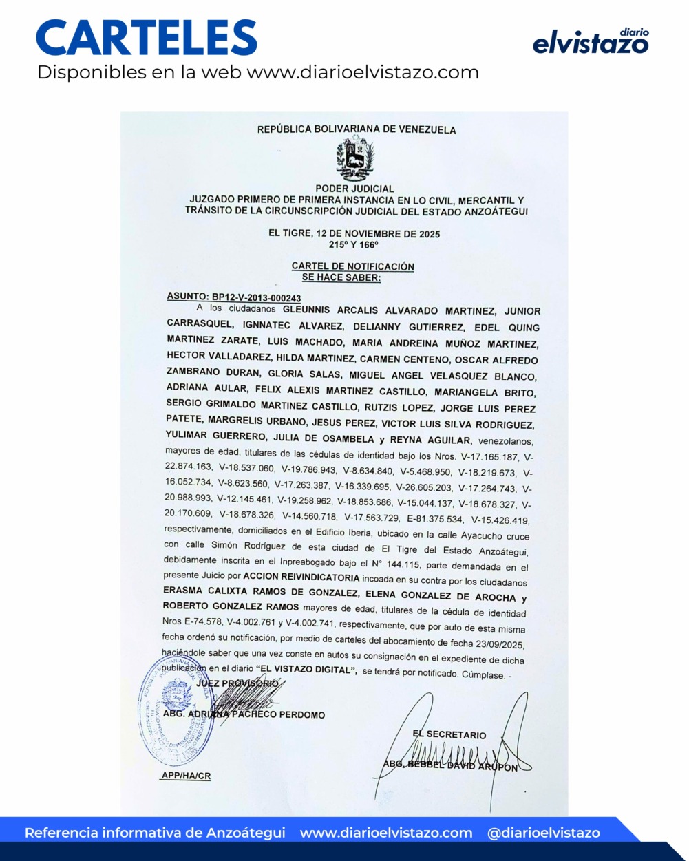 El Juzgado Primero de Primera instancia en lo Civil, Mercantil y Tránsito de la Circunscripción Judicial de El Tigre, estado estado Anzoátegui, dirigido por la juez Adriana Pacheco Perdomo, emitió un Cartel de Notificación por el Juicio de Acción Reivindicatoria de fecha 12 de noviembre de 2025, en atención a múltiples ciudadanos domiciliados en el Edificio Iberia de El Tigre, estado Anzoátegui: