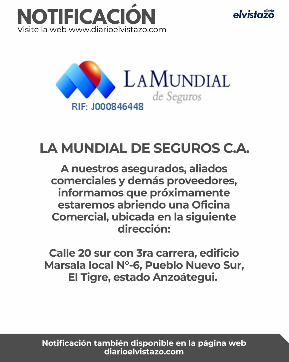 LA MUNDIAL DE SEGUROS C.A. RIF No. J-000846448, inscrita en la Superintendencia de la Actividad Aseguradora bajo el No. ES-073A. A nuestros asegurados, aliados comerciales y demás proveedores, informamos que próximamente estaremos abriendo una Oficina Comercial, ubicada en la siguiente dirección: Calle 20 sur con 3ra carrera, edificio Marsala local N°-6, Pueblo Nuevo Sur, El Tigre, estado Anzoátegui.