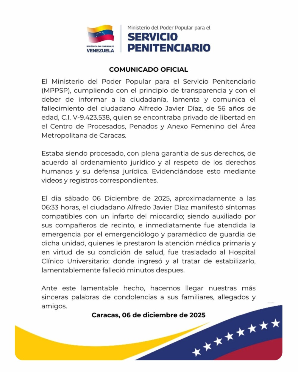 «Alfredo Díaz, de 56 años, murió de un infarto al miocardio mientras estaba privado de libertad en el Centro de Procesados, Penados y Anexo Femenino del Área Metropolitana de Caracas», detalla el comunicado oficial publicado la tarde del sábado 6 de diciembre, horas después de que el partido Acción Democrática divulgó la noticia del fallecimiento de su militante.