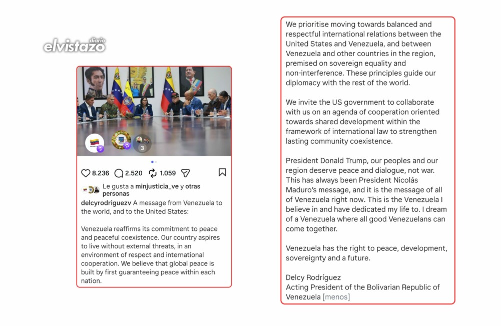 En un comunicado difundido aproximadamente a las 10:00 pm del domingo 4 de enero después de liderar su primer Consejo de Ministros, Delcy Rodríguez invita al gobierno estadounidense «a colaborar en una agenda de cooperación».