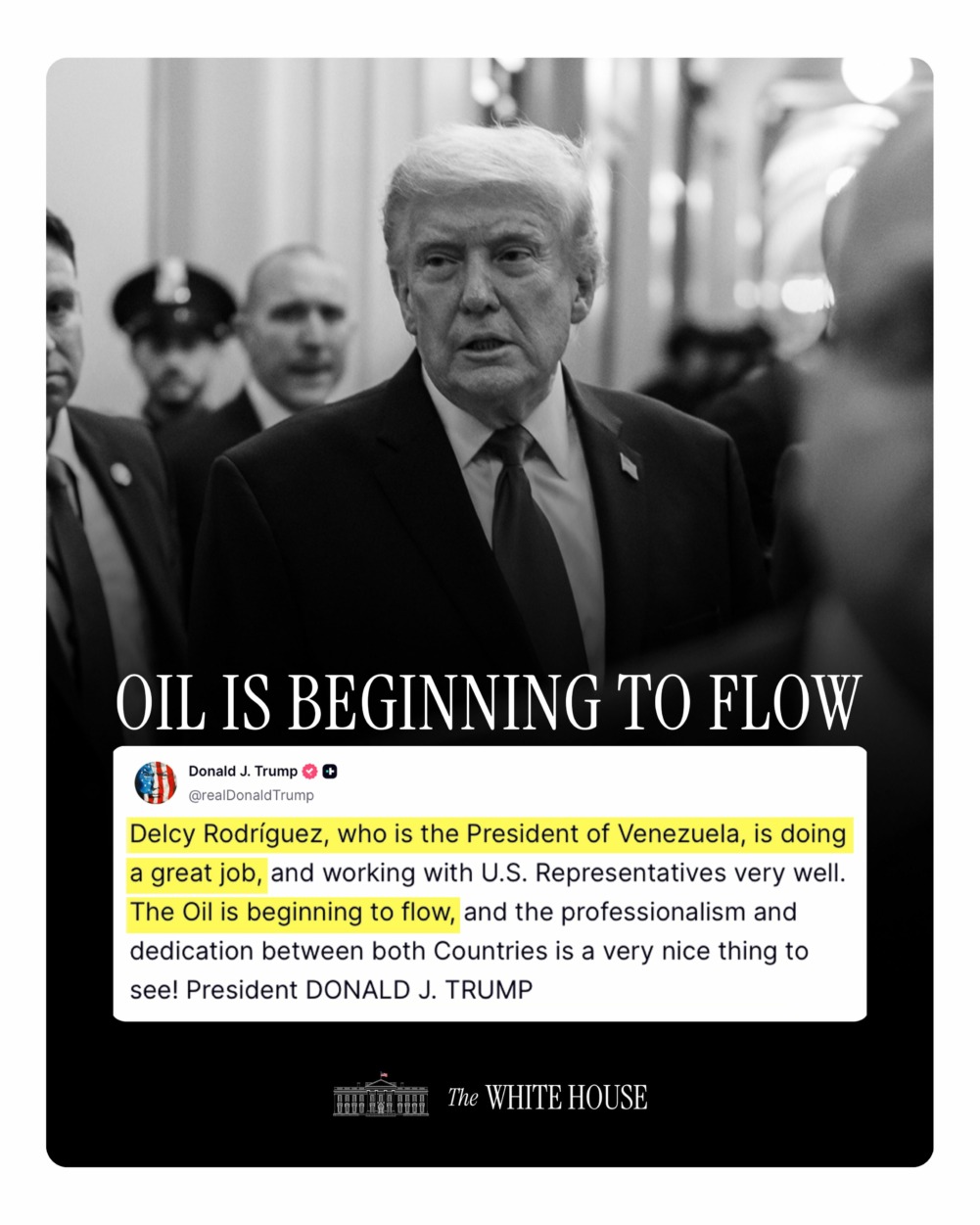 «Delcy Rodríguez, presidenta de Venezuela, está haciendo un excelente trabajo y colaborando muy bien con los representantes estadounidenses. El petróleo está empezando a fluir; el profesionalismo y la dedicación entre ambos países es algo muy grato de ver». — Presidente Donald J. Trump.