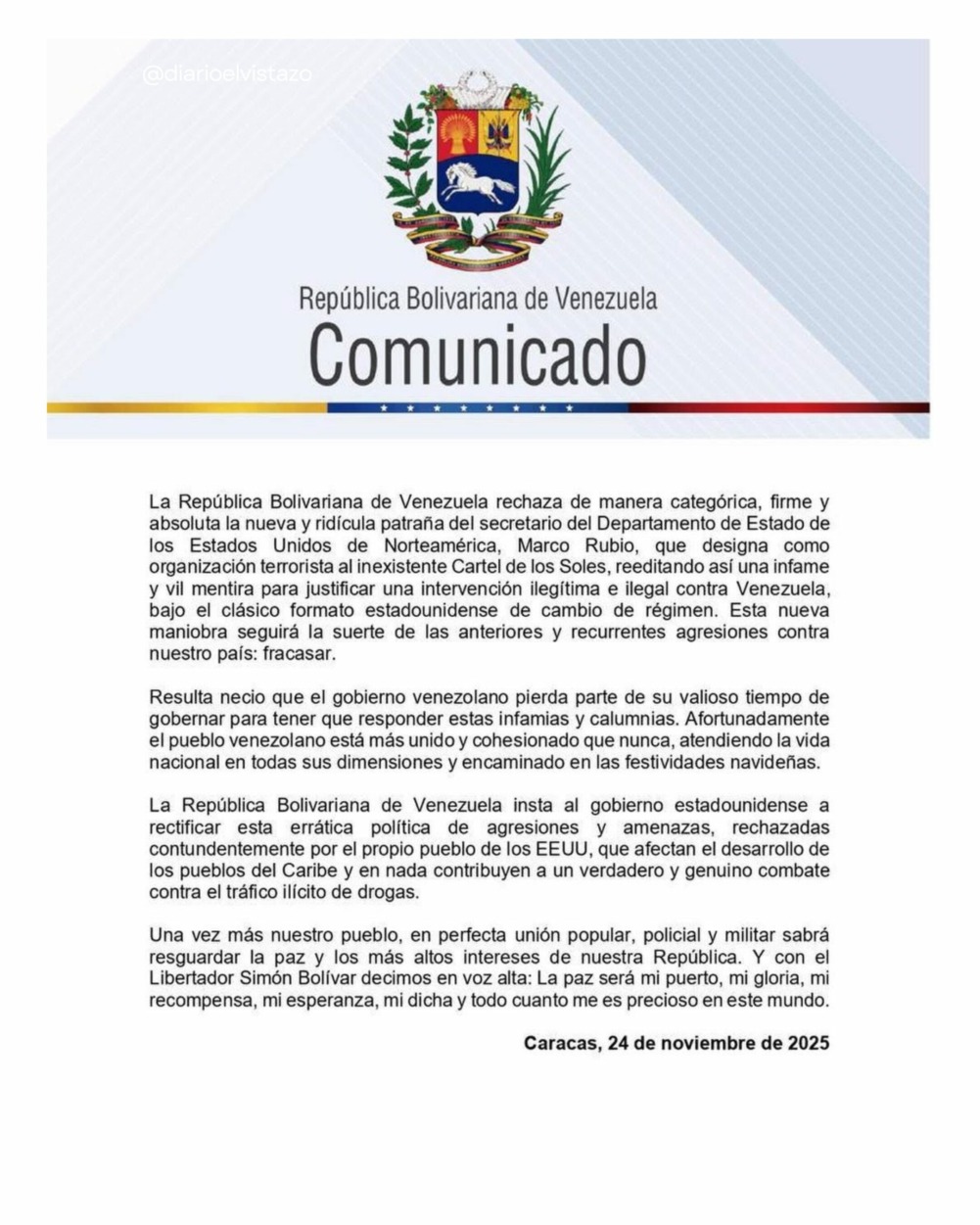 La mañana del lunes 24 de noviembre el Gobierno venezolano emitió un comunicado para rechazar la designación como organización terrorista del llamado Cartel de los Soles, medida vigente desde la madrugada por parte de la administración Trump.